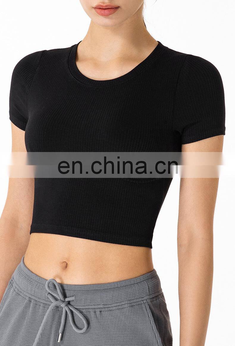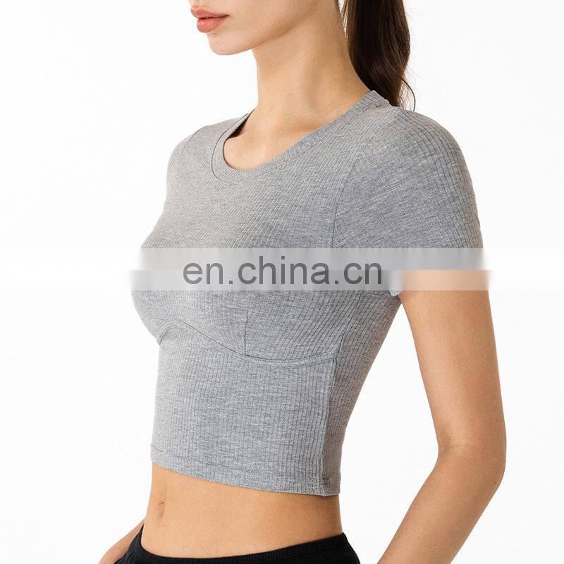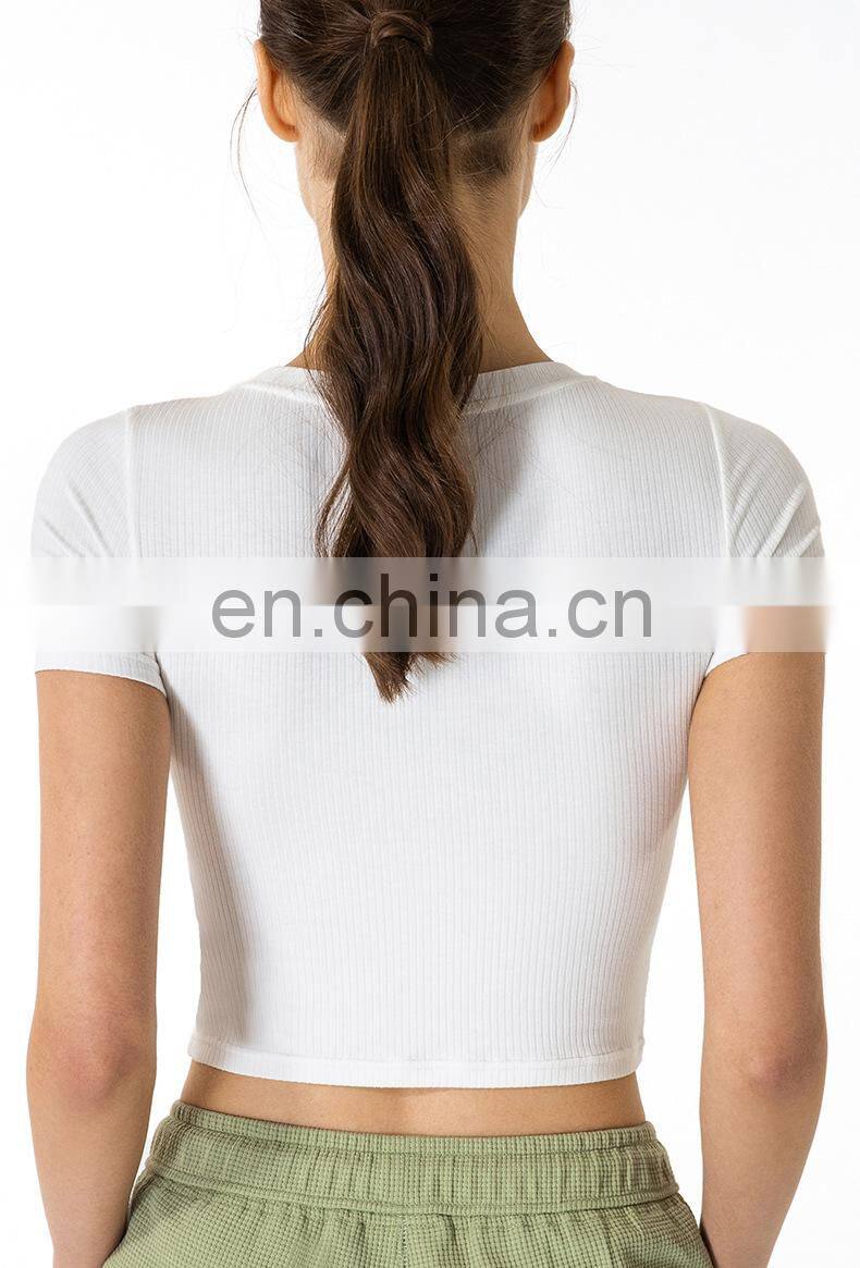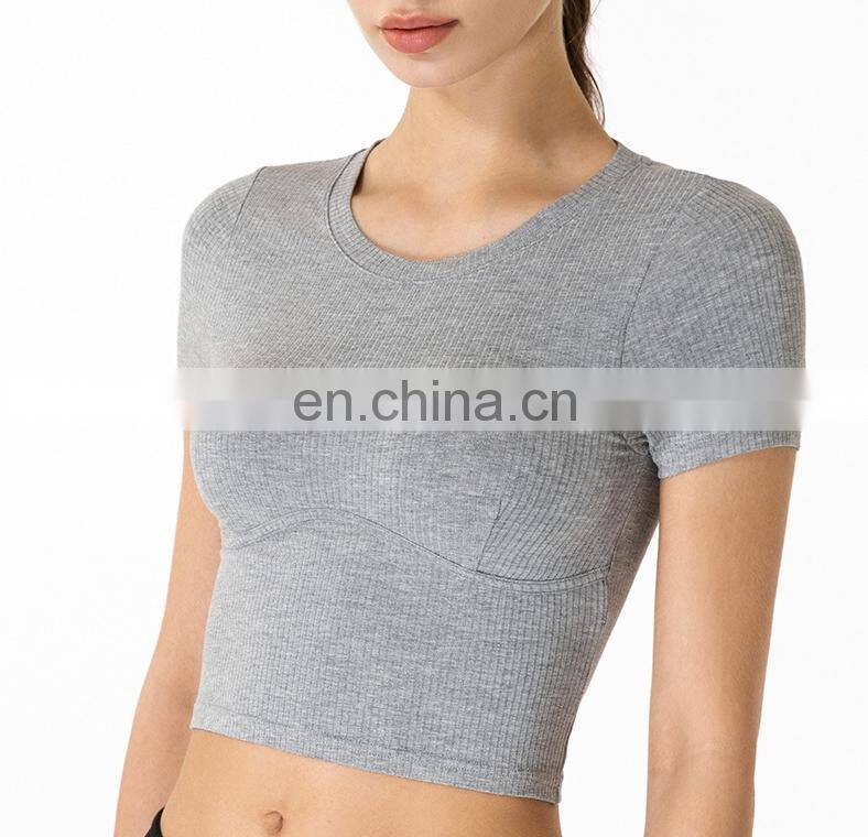 Wholesale Blank Custom Ribbed Breathable Fitness Sports Workout T-Shirt Crop Top Solid Color Gym Athletic Yoga Tee Shirts Women