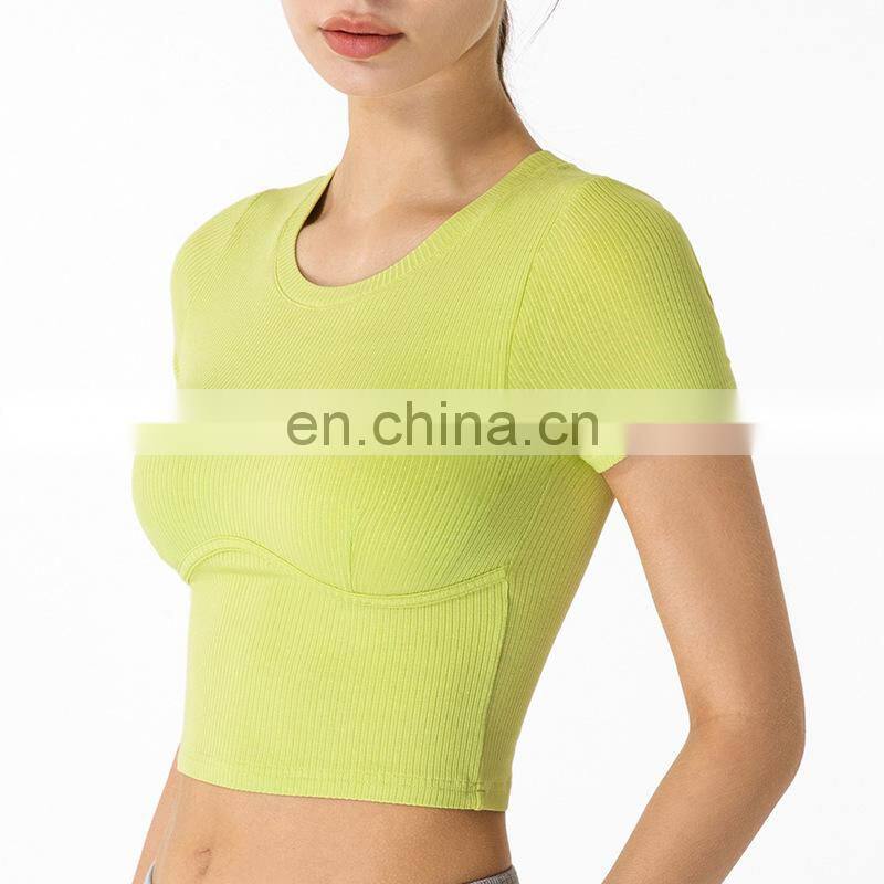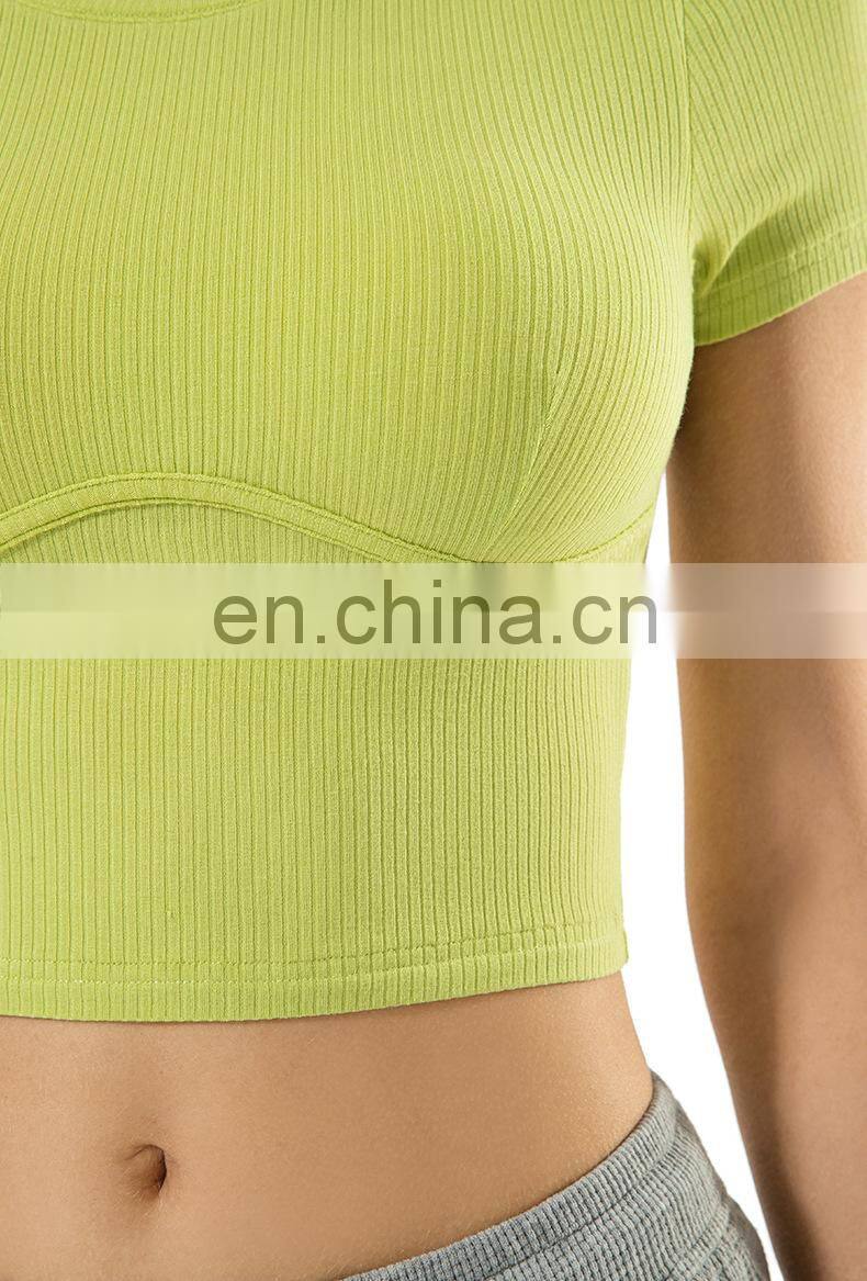 Soft Slim Fit Gym Fitness Sports Yoga Crop Top Built In Bra Padded Workout Running Training Wear Clothes T Shirts For Women