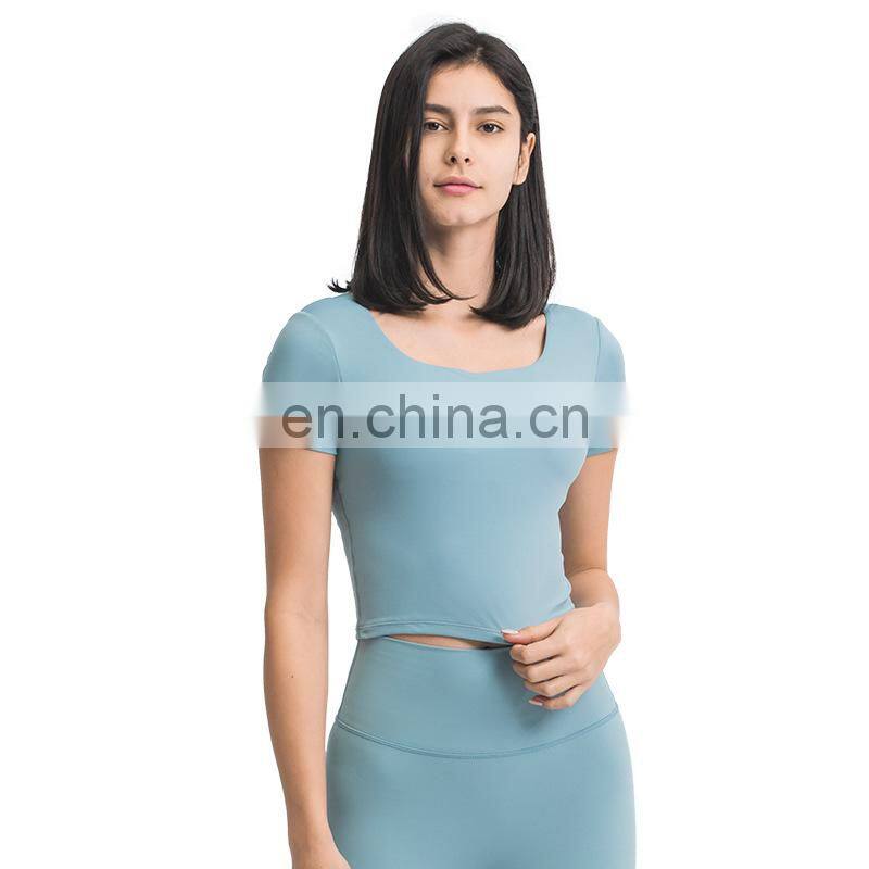 Wholesale New Nude Feeling Short Sleeve Workout Running Sports T Shirt With Built In Bra Gym Yoga Women Crop Top