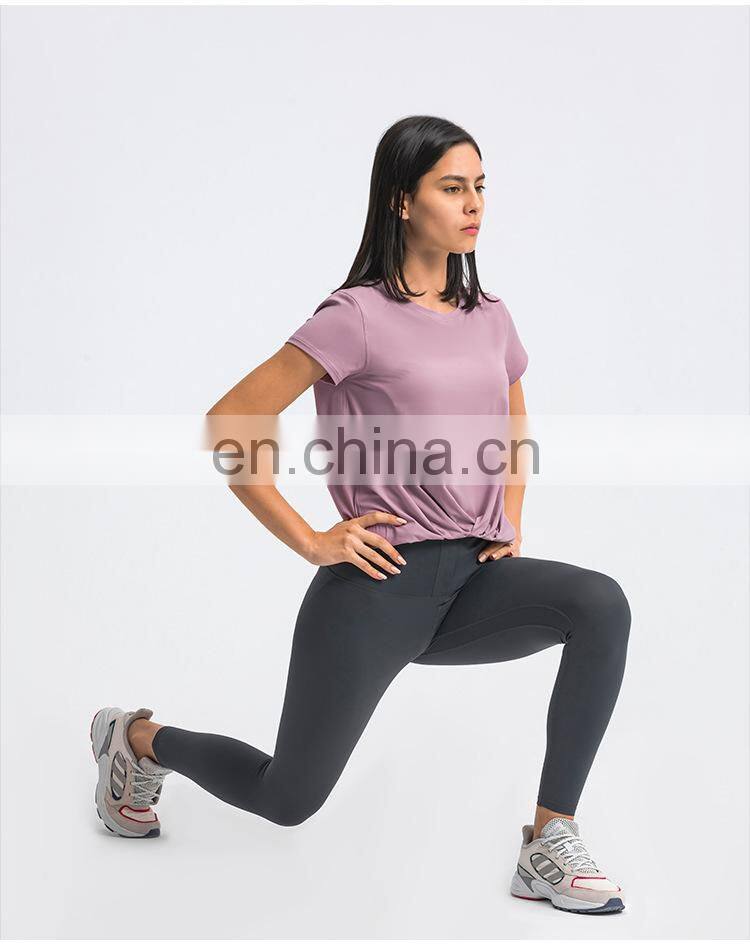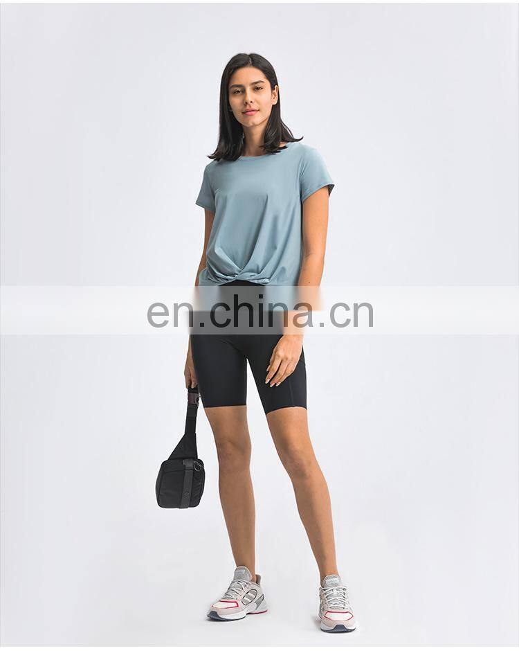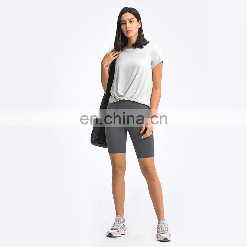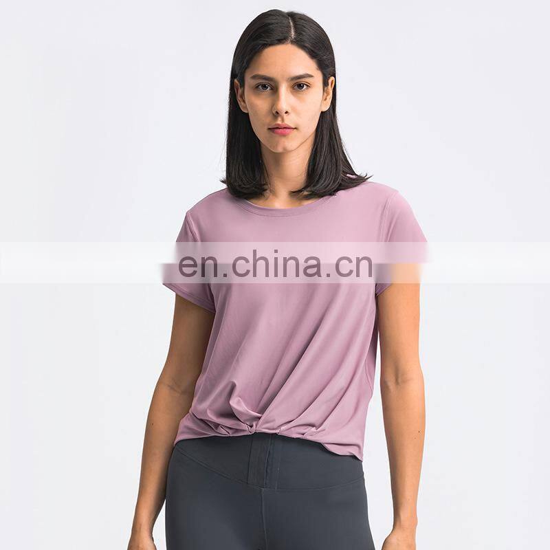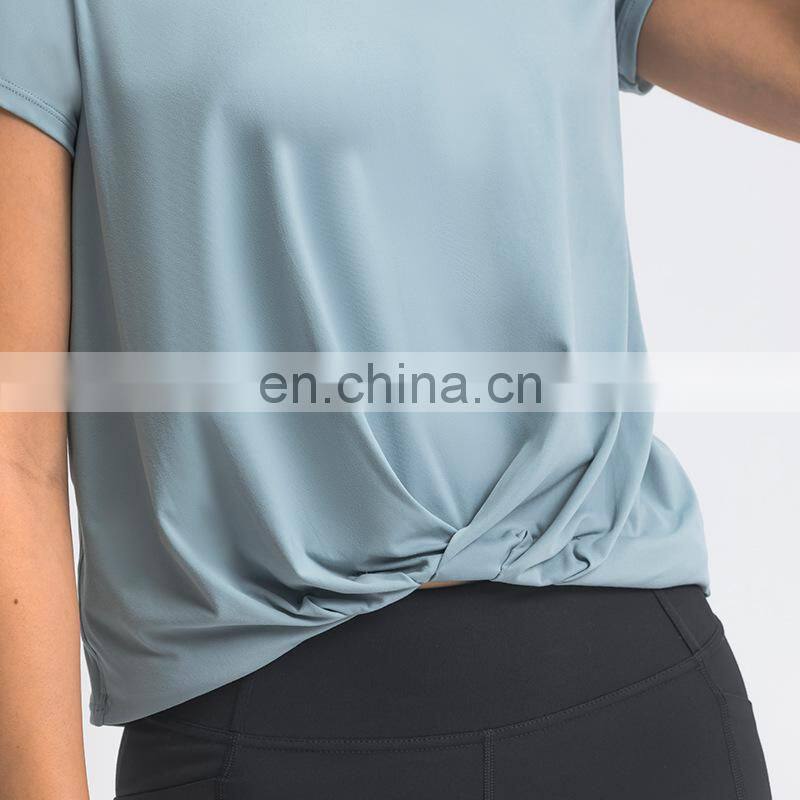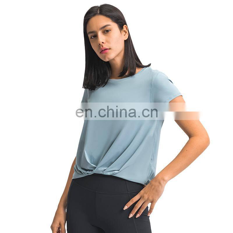 Home > Products > Yoga T shirt > Summer Fashion Front Ruched Sport Fitness Clothing Loose Sweating-Wicking Workout Gym Wear Women Yoga T Shirt
