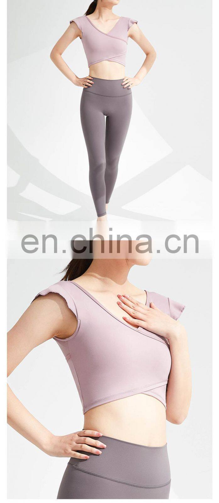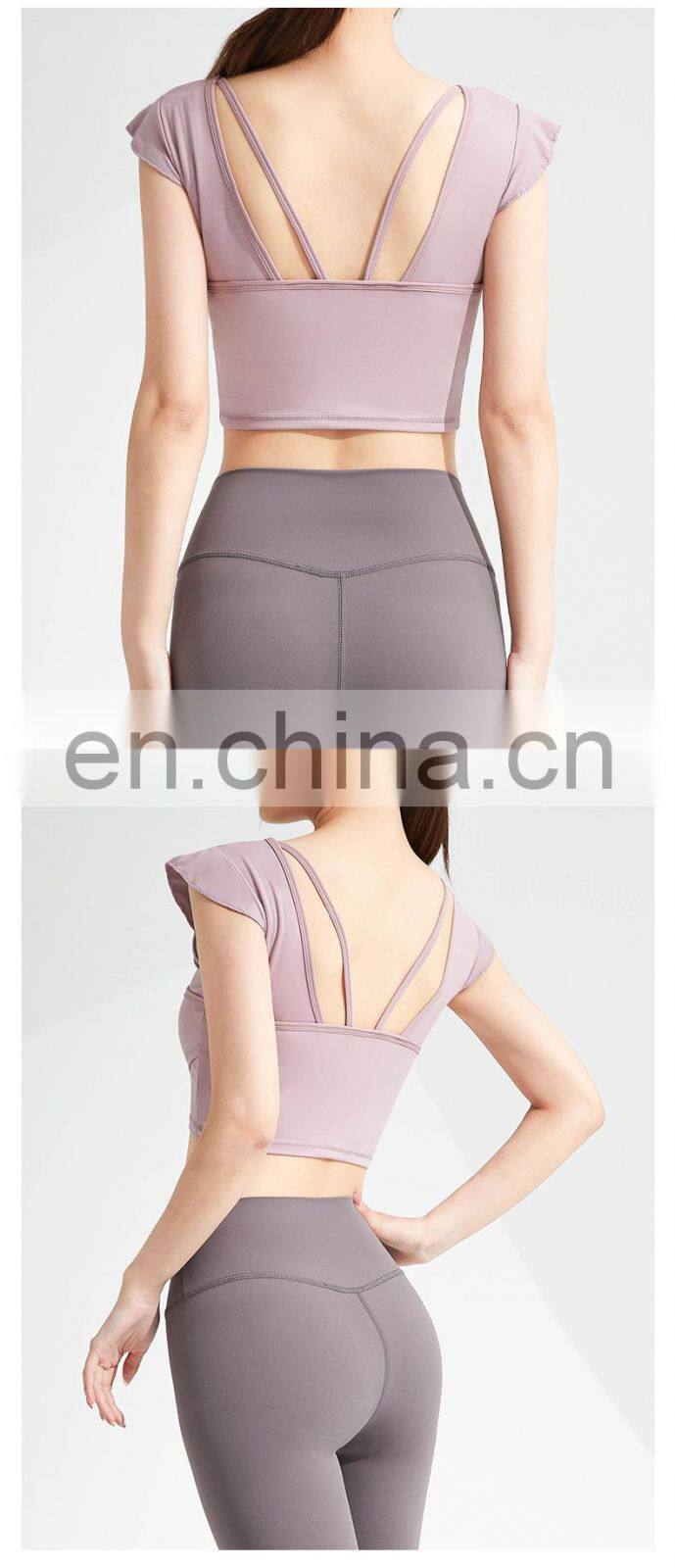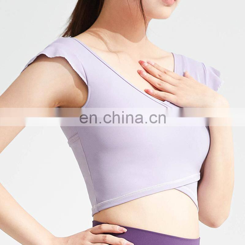 Wholesale Custom Logo Front Cross Ruffle Sleeve Yoga Tee Ladies Gym Sports Wear Yoga Crop Top Women High Quality Yoga T-Shirt