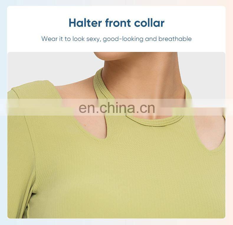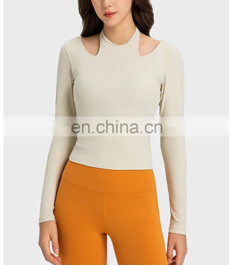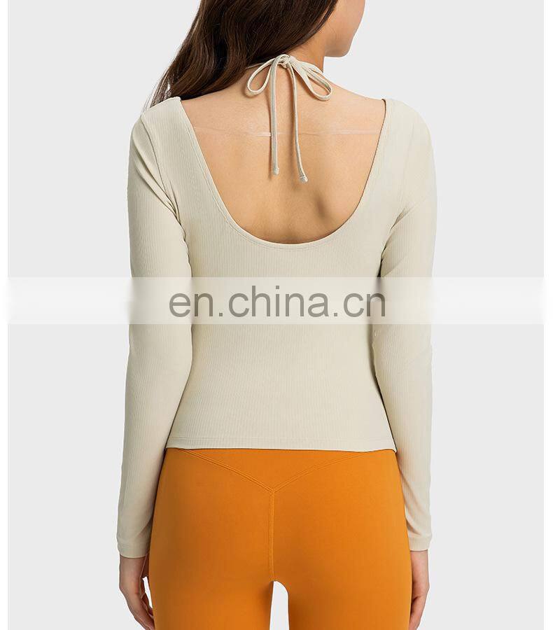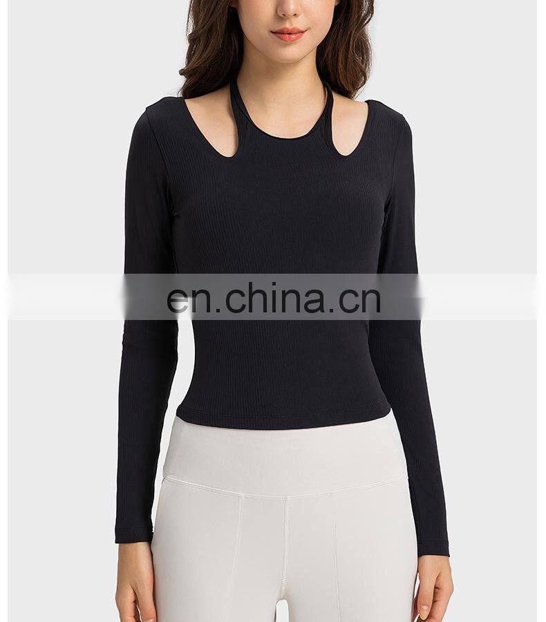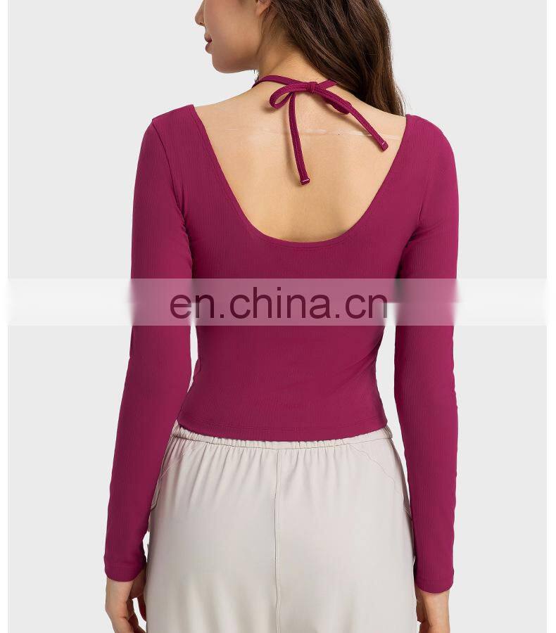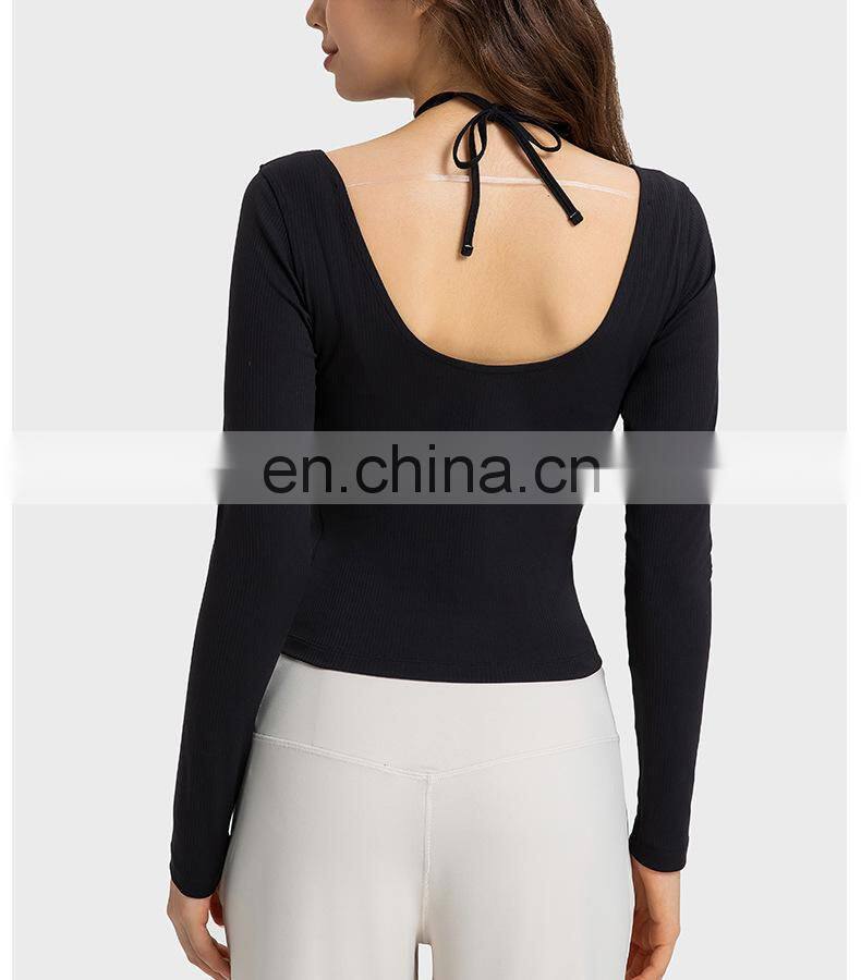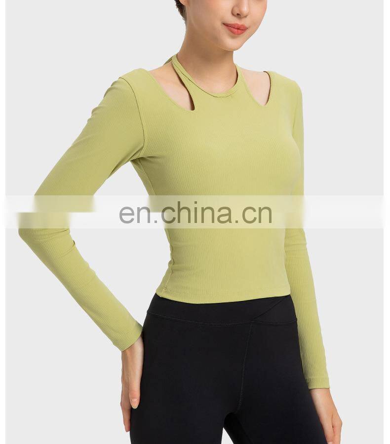 New Ladies T-shirt Running Wear Custom Sports Shirts Gym Fitness Top Women Long Sleeve Ribbed Strappy Halter Yoga T Shirt