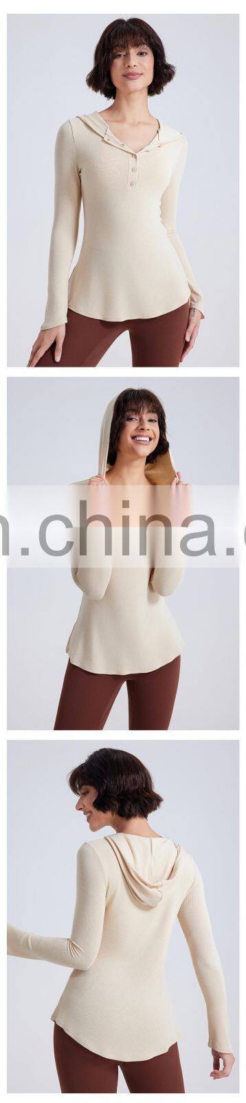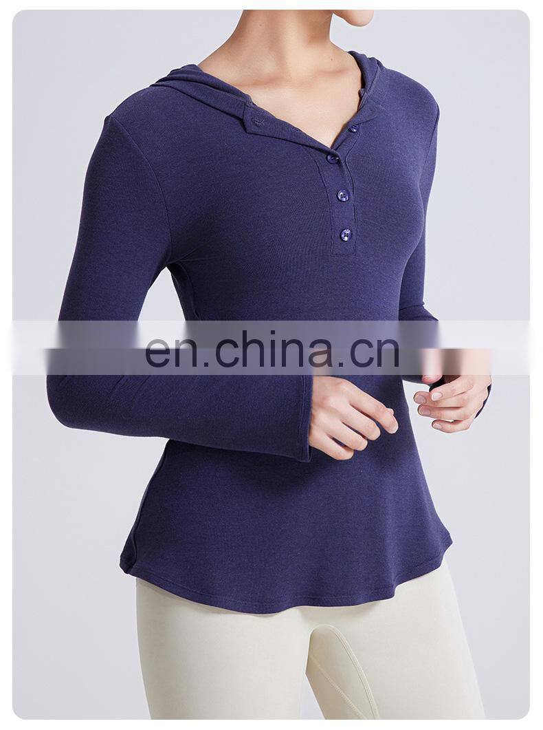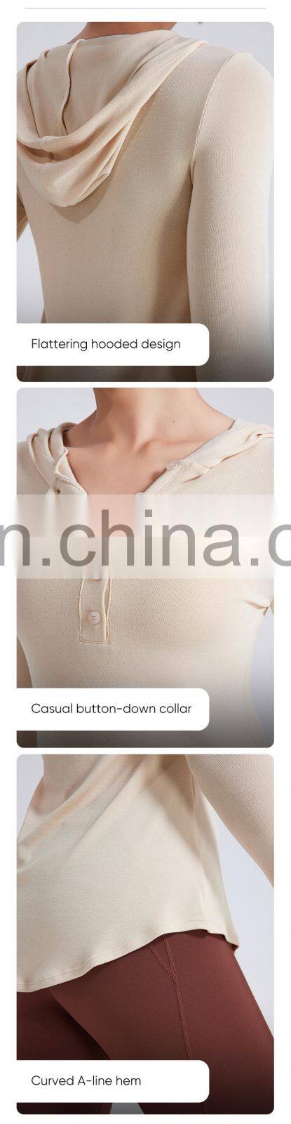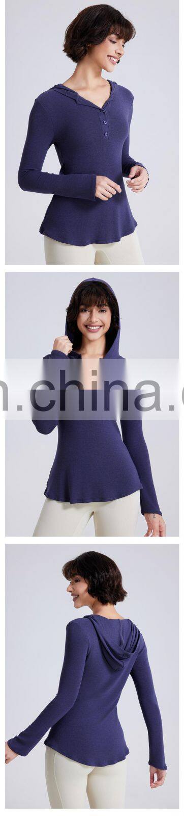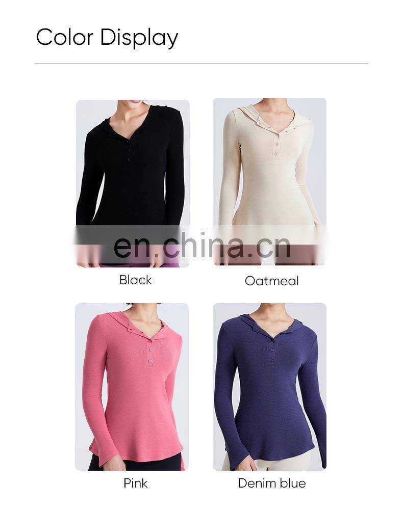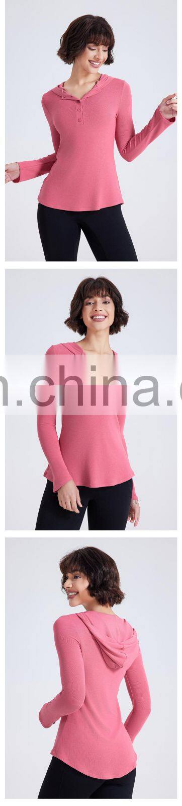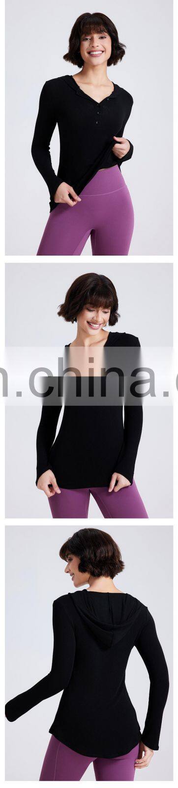 Wholesale Fall Winter T-shirt Long Open Neck Running Shirts Custom Gym Fitness Tops Long Sleeve Hooded T Shirt Women Yoga Top