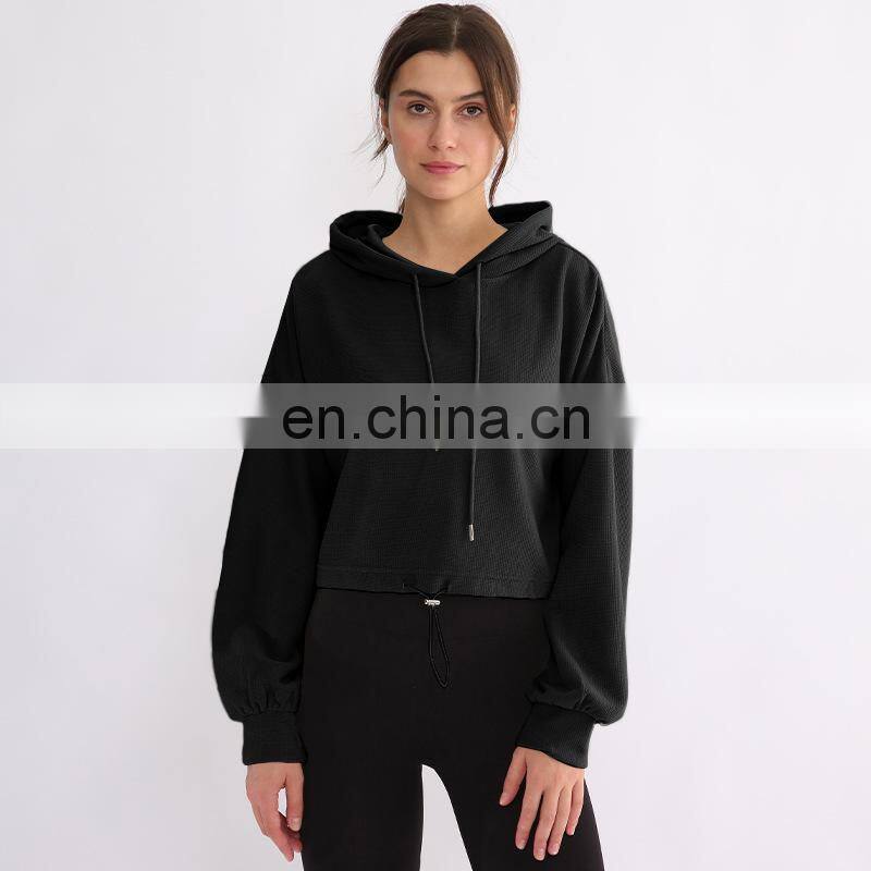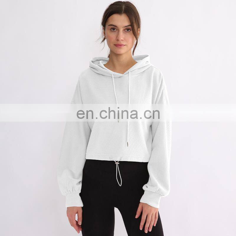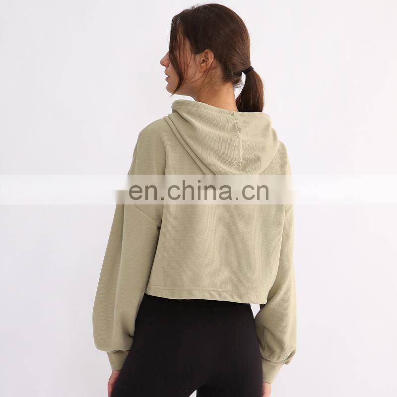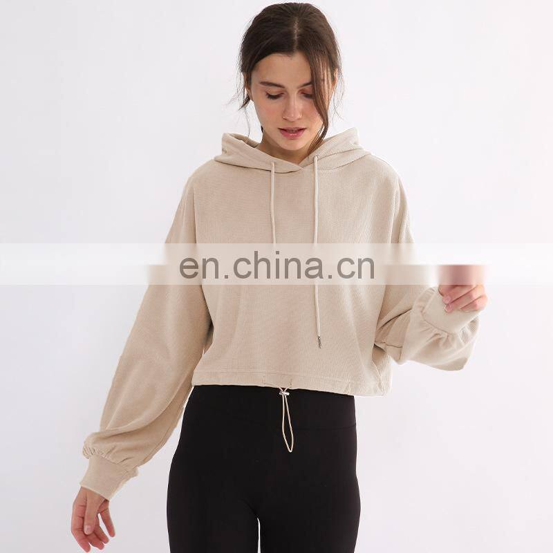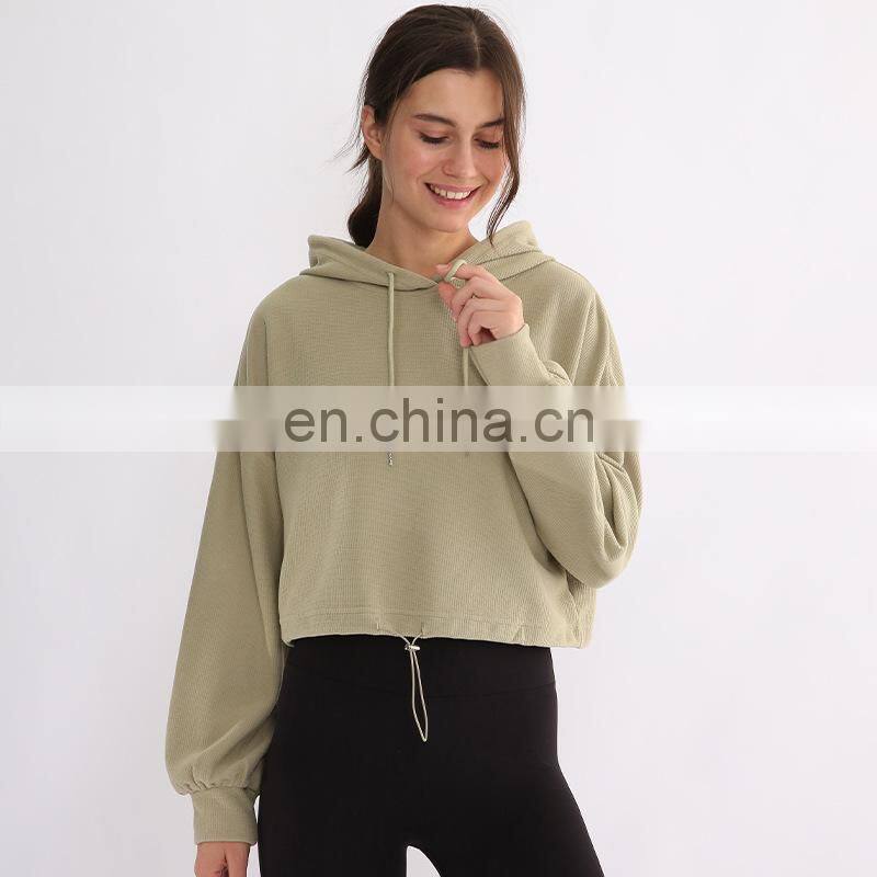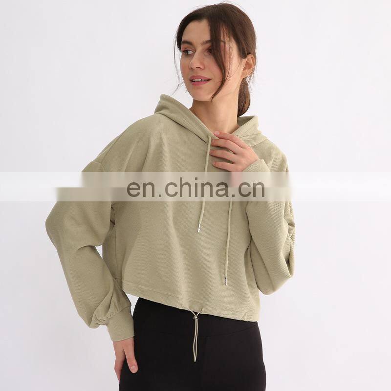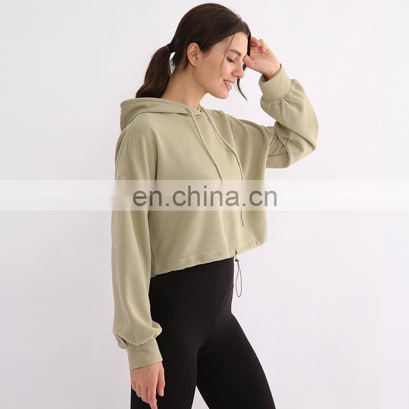 High Quality Outdoor Running Fitness Top Shoulder Drop Crop Top Long Sleeve Cotton Pullover Drawstring Hooded Sweatshirt Women