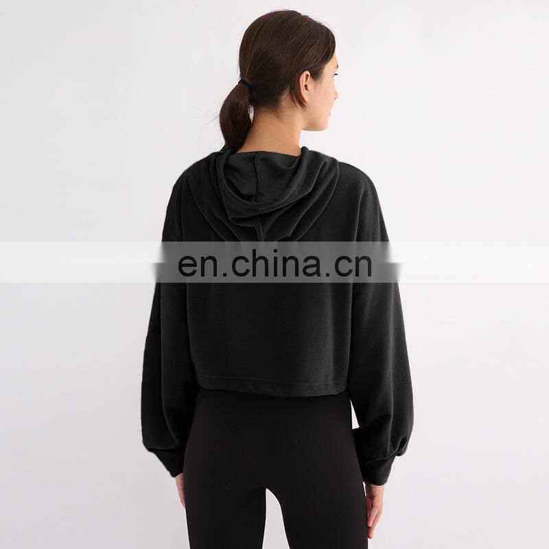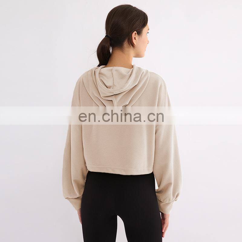 Home > Products > Yoga T shirt > High Quality Outdoor Running Fitness Top Shoulder Drop Crop Top Long Sleeve Cotton Pullover Drawstring Hooded Sweatshirt Women