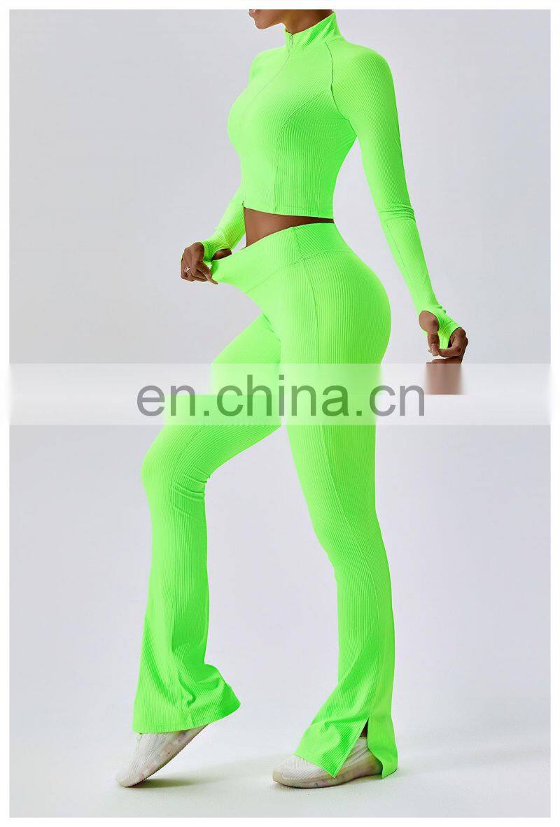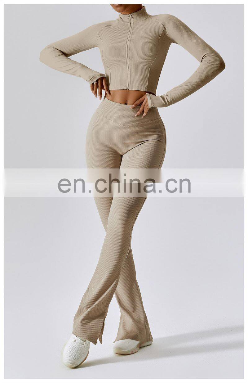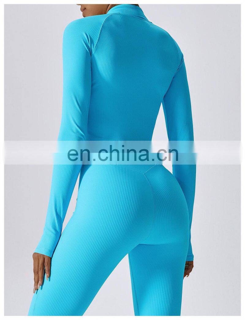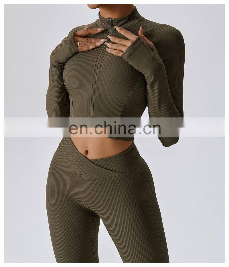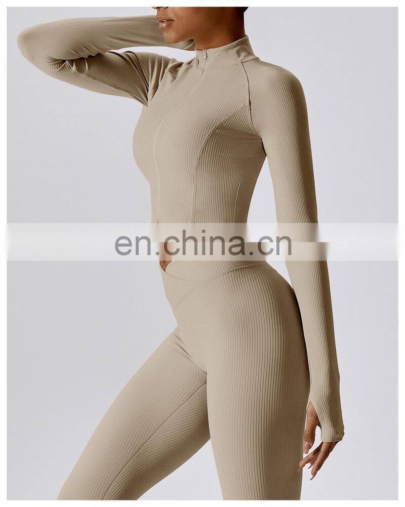 Quick-Drying Long-Sleeved Crop Yoga Jacket Workout Wear Women Zipper Jacket Slim Fit Gym Fitness Ribbed Short Yoga Jackets