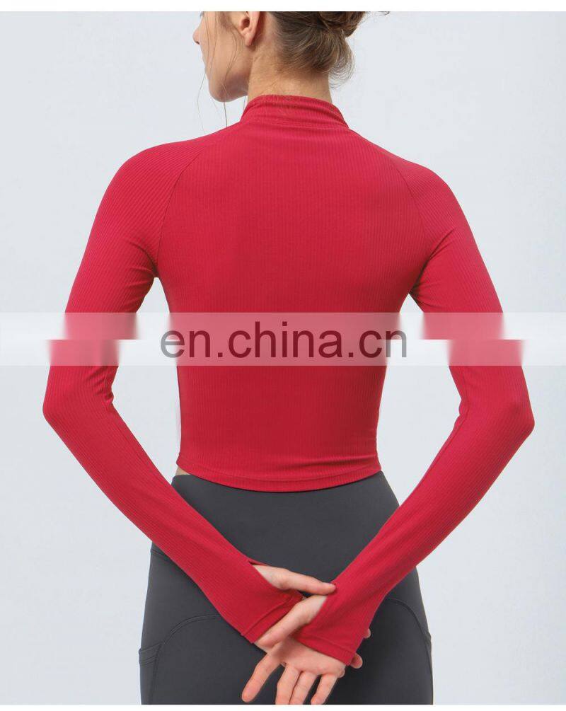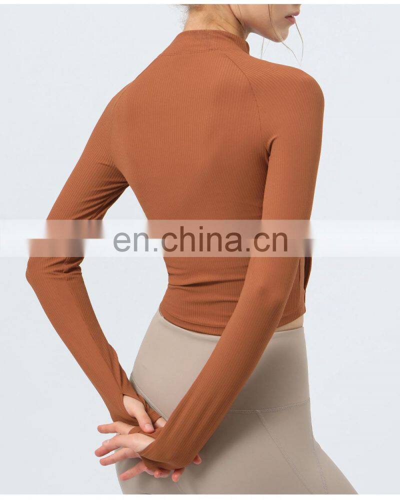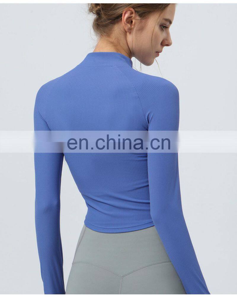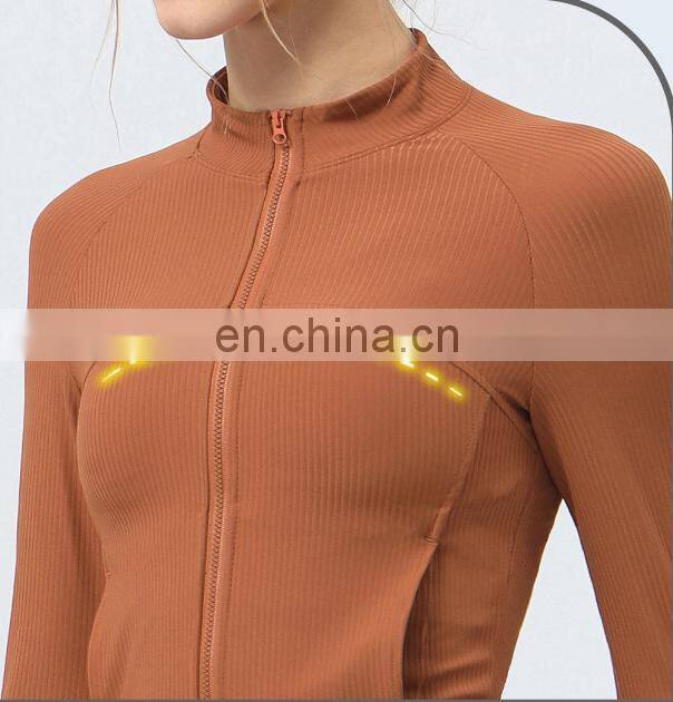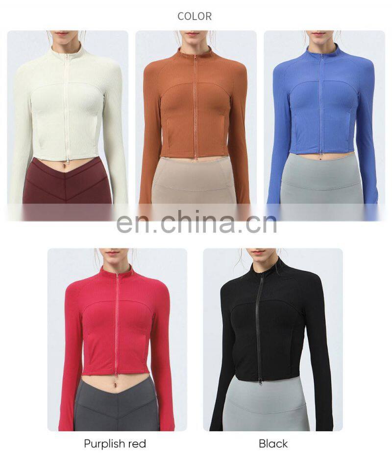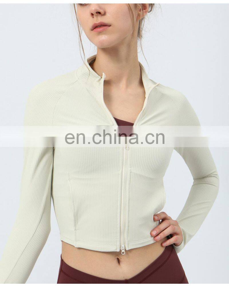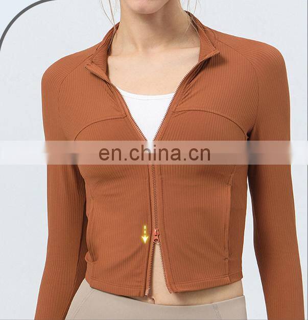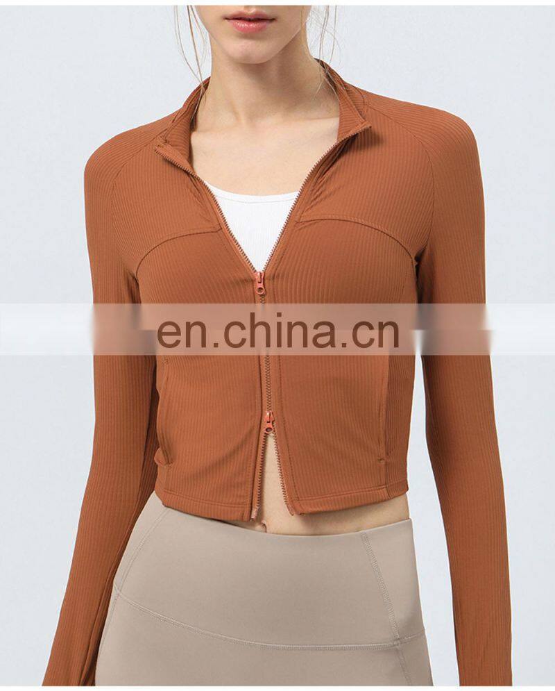 Custom Workout Wear Double Head Zipper Stand Collar Sports Coat Gym Fitness Tops Long Sleeve Ribbed Short Yoga Jacket For Women
