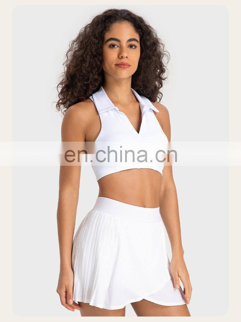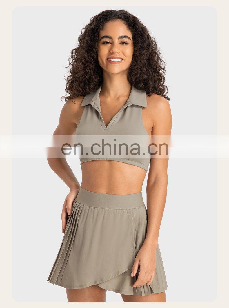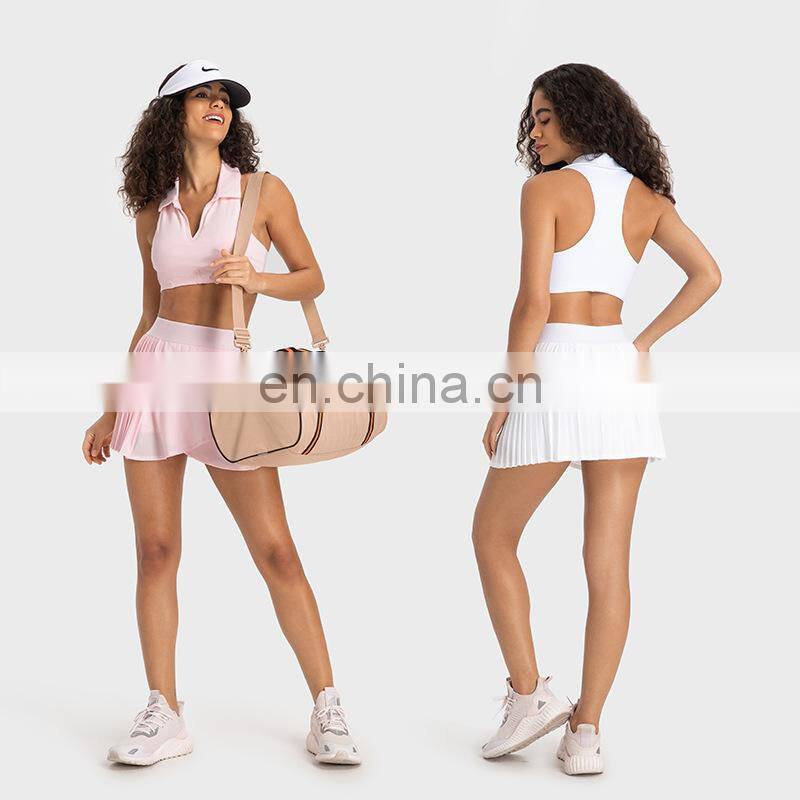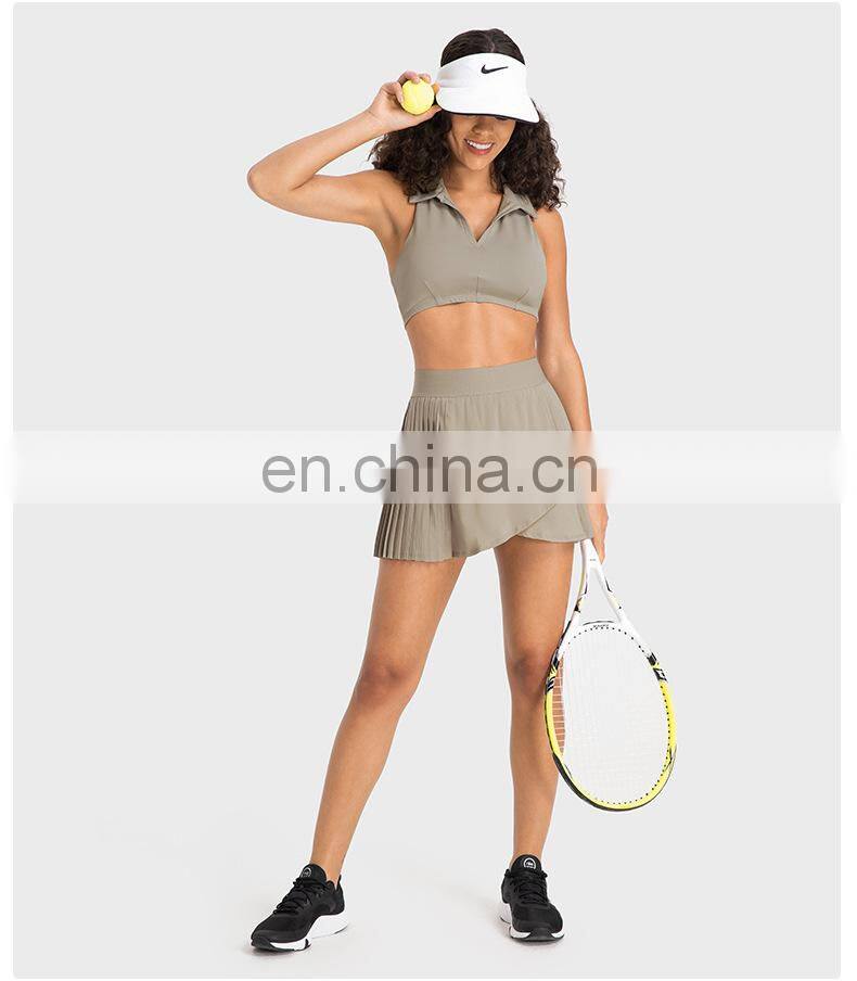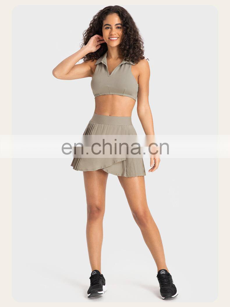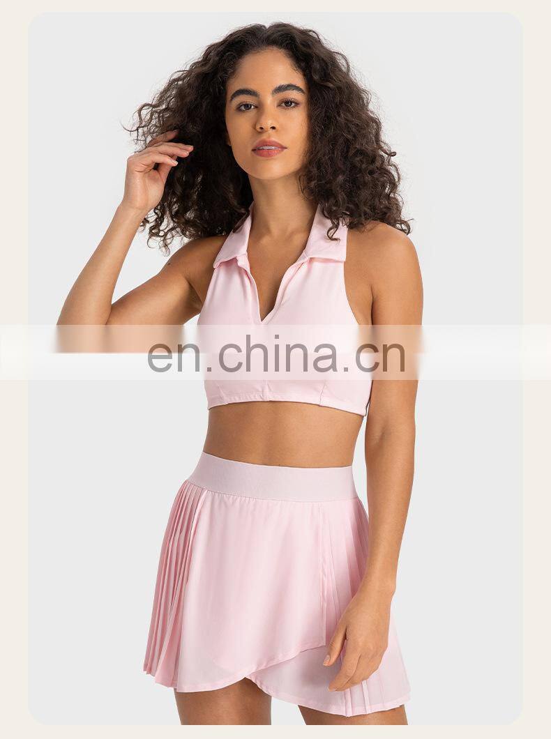 Fashion New Style Two Piece Lapel Racerback Sports Bra High Waist Pleated Mini Skirt Golft Tennis Outdoor Fitness Wear Yoga Set