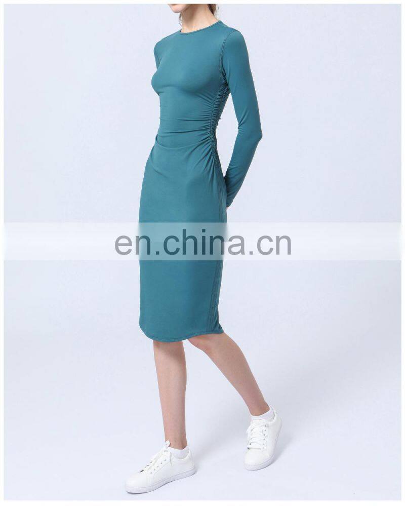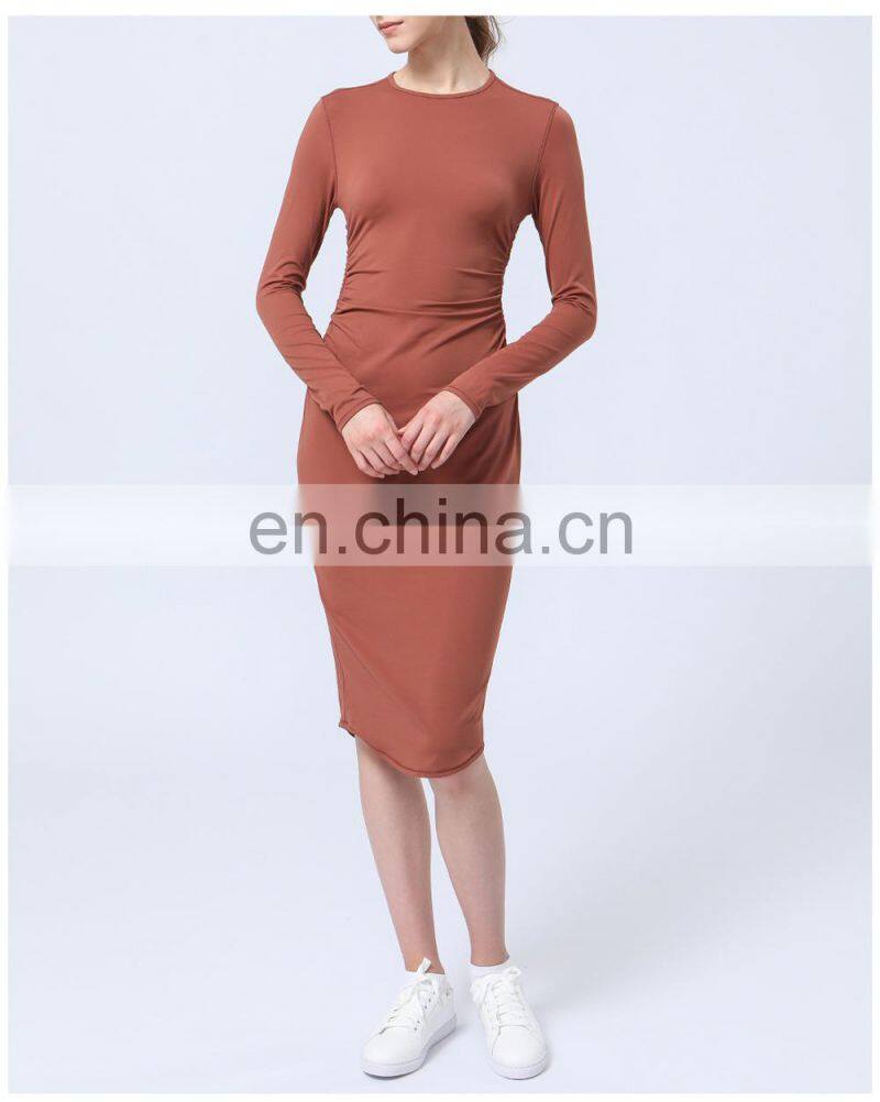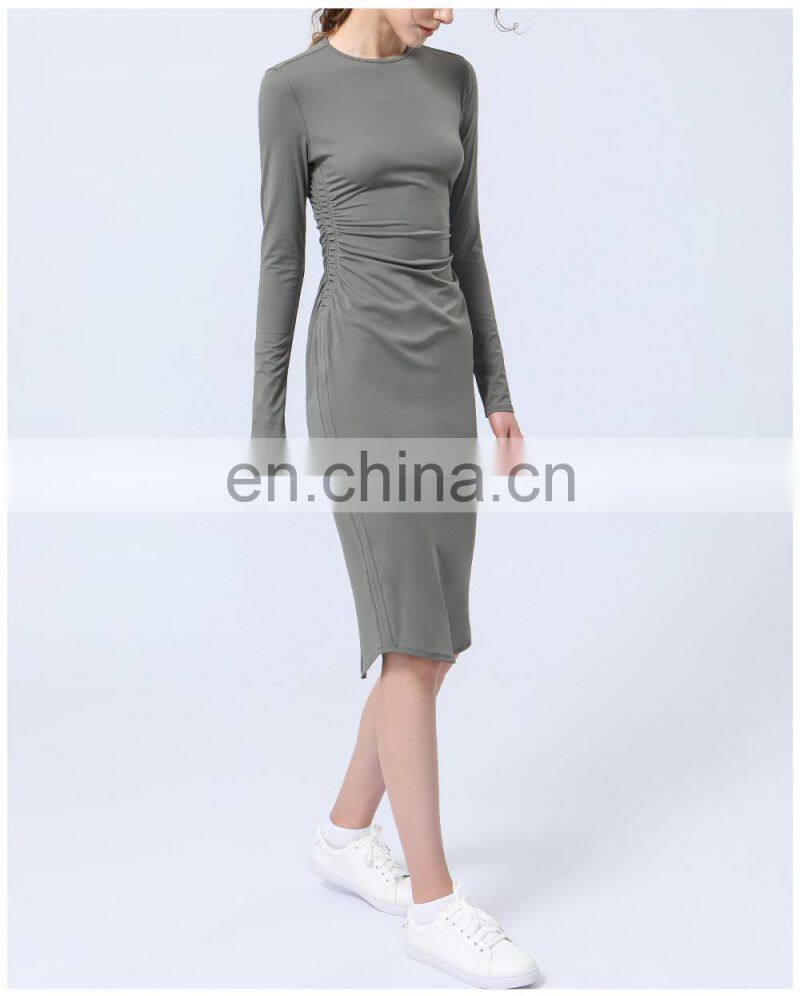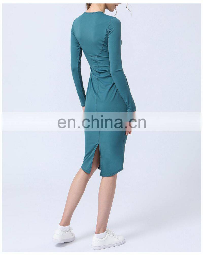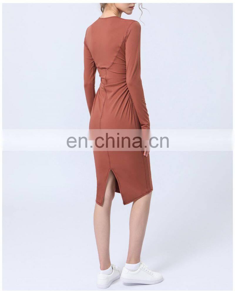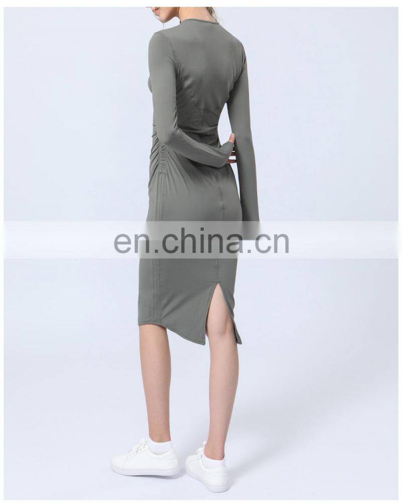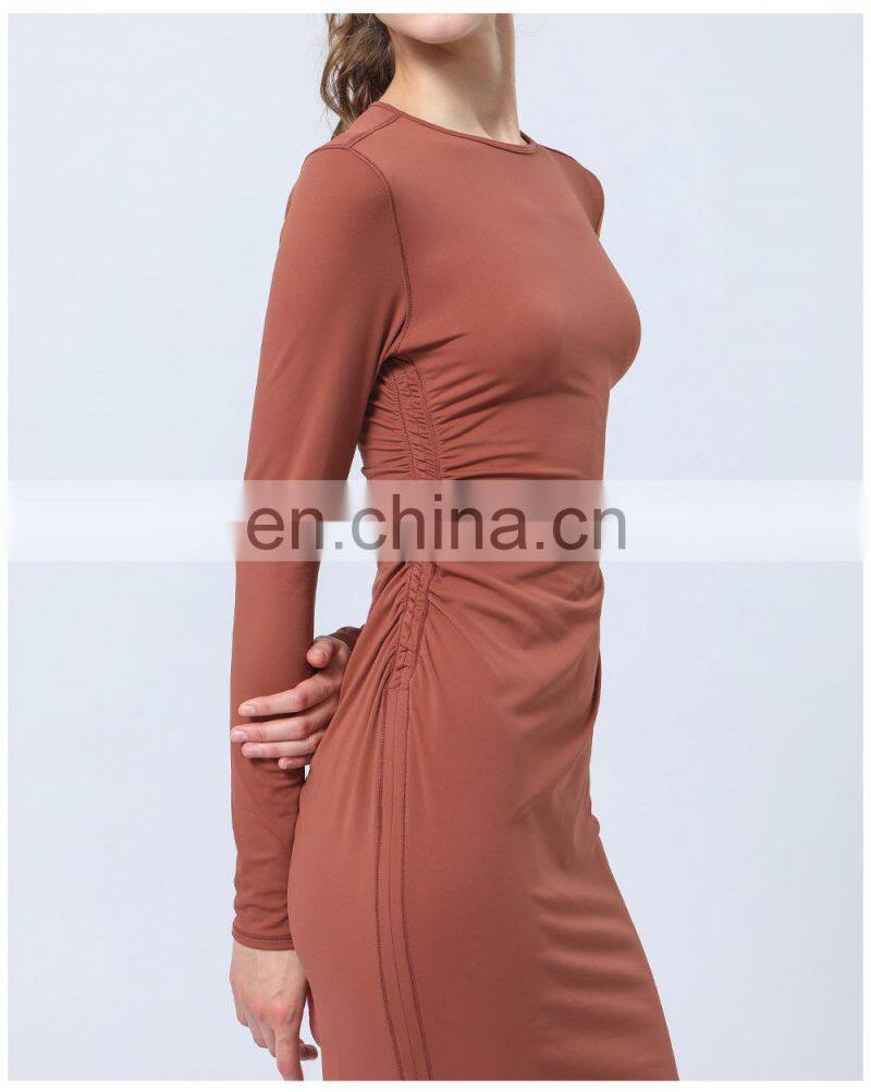 Long Sleeve Waisted Ruffles Split Back Yoga Dress Custom Logo Workout Clothing Gym Fitness Wear Yoga Skirt Women Sports Dress