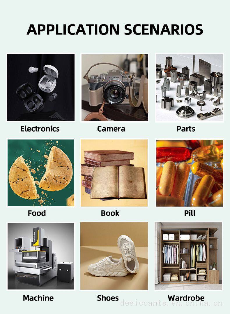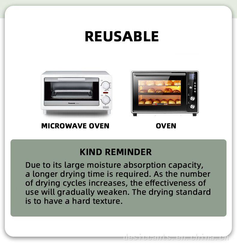 Silica desiccant: Silicone itself is a neutral substance that will not react with any other substance except for strong bases and acids under certain conditions. Meanwhile, silicone is also the only desiccant certified by the US FDA that can be used in direct contact with drugs and food.And it's reusable.