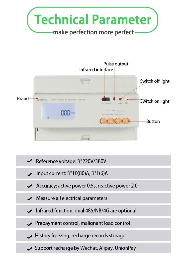 ADL300-EY Three Phase Prepaid Electric Energy Meter With Rs485 4 Tariff Rates 35mm Din Rail 3*1(6)A/10(80)A Current Input