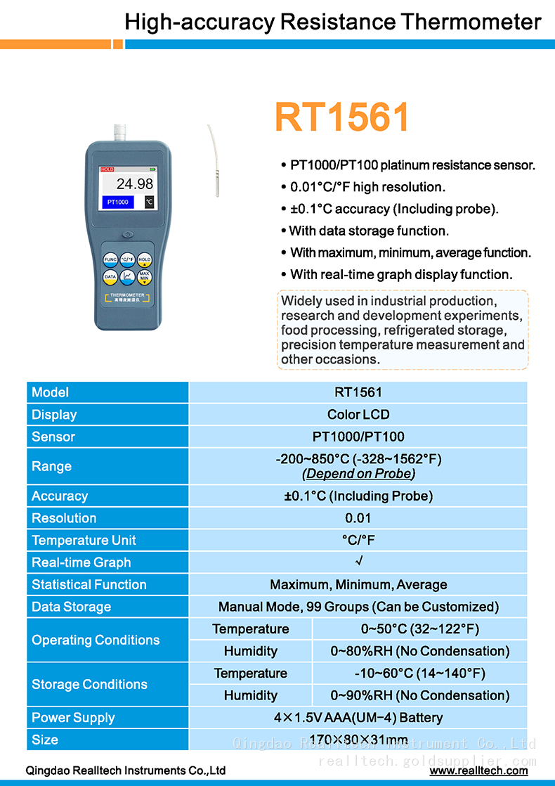 Rt1561 is a high-precision RTD thermometer that uses PT1000 /Pt100 platinum thermal resistance as a sensor to measure temperature signals. Large Color LCD display, 0.01°C high resolution, accuracy up to ±0.1°C. With real-time measurement graph display function. With data storage and view functions. Widely used in industrial production, research and development experiments, food processing, refrigerated storage, precision temperature measurement and other occasions.