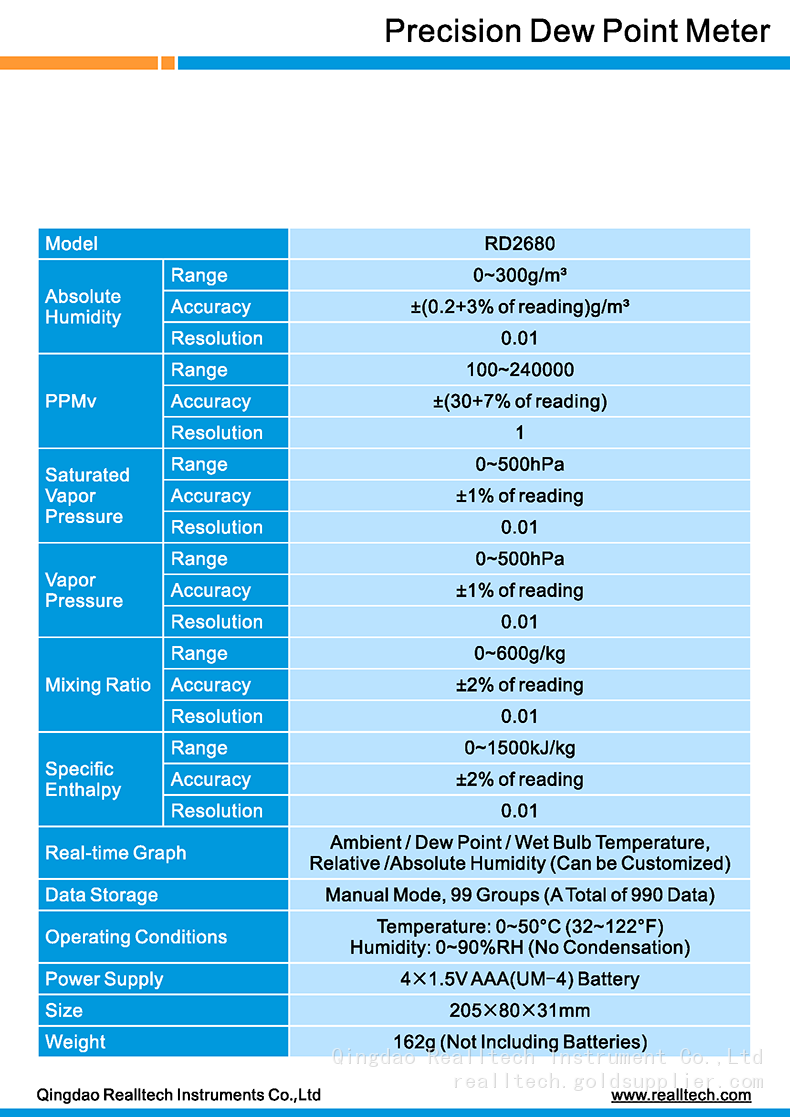 It is a high-precision professional dew point meter. It is able to measure Ambient Temperature, Dew Point Temperature, Wet Bulb Temperature, Relative Humidity, Absolute Humidity, PPMv, Saturated Vapor Pressure, Vapor Pressure, Mixing Ratio, Specific Enthalpy. Widely used in laboratories, precision manufacturing, modern agriculture, meteorological measurement, chemical and pharmaceutical, power industry, HVAC and other temperature and humidity monitoring occasions.