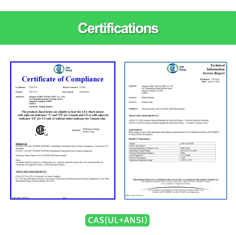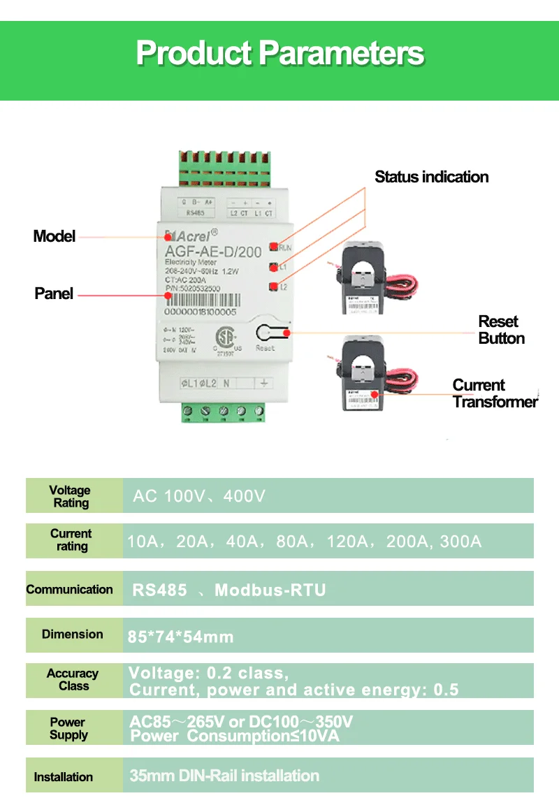 Acrel UL AGF-AE 1-Phase 3-Wire Solar Power Monitoring Energy Meter With 2 Split Core 200A Current Sensor Rs485 Modbus-RTU
