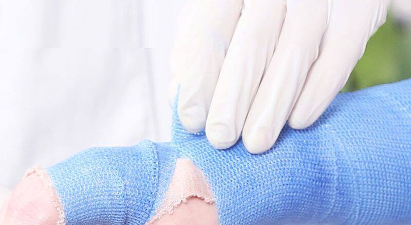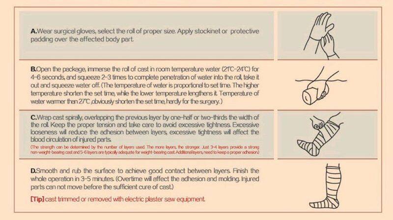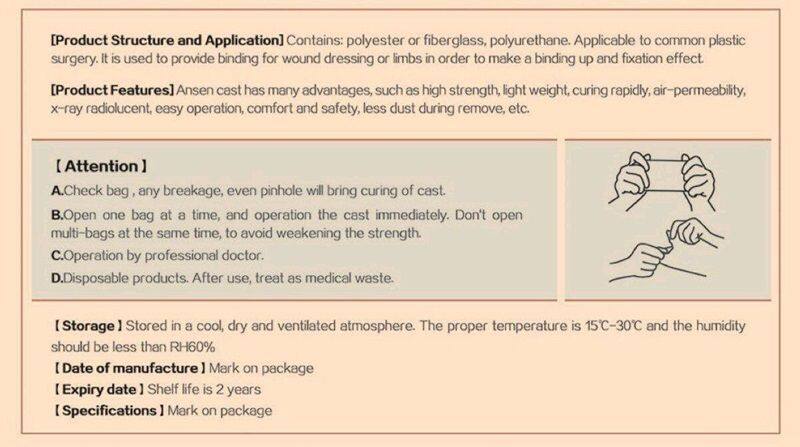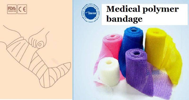 Medical polymer bandage is mainly composed of glass fiber, polyurethane, polyether diol, polyether terpolymer and inner and outer woven fabric. This kind of bandage and splint made of polymer material is more convenient than plaster bandage in plastic surgery and orthopedics. It has the advantages of environmental protection, good air permeability, easy operation, convenient removal, no irritation to human skin, increased comfort, also conducive to X-ray machine fluoroscopy, no need to remove before fluoroscopy. The product has CE and FDA certification.