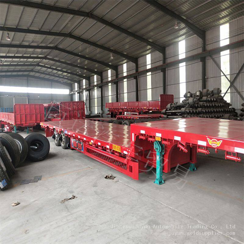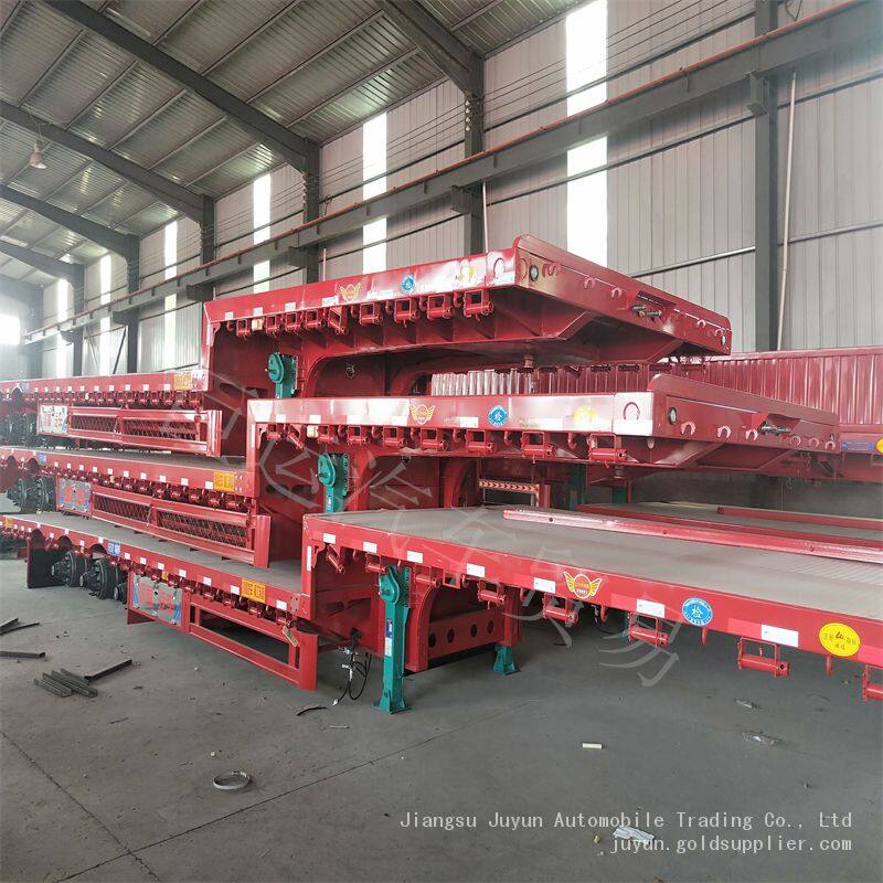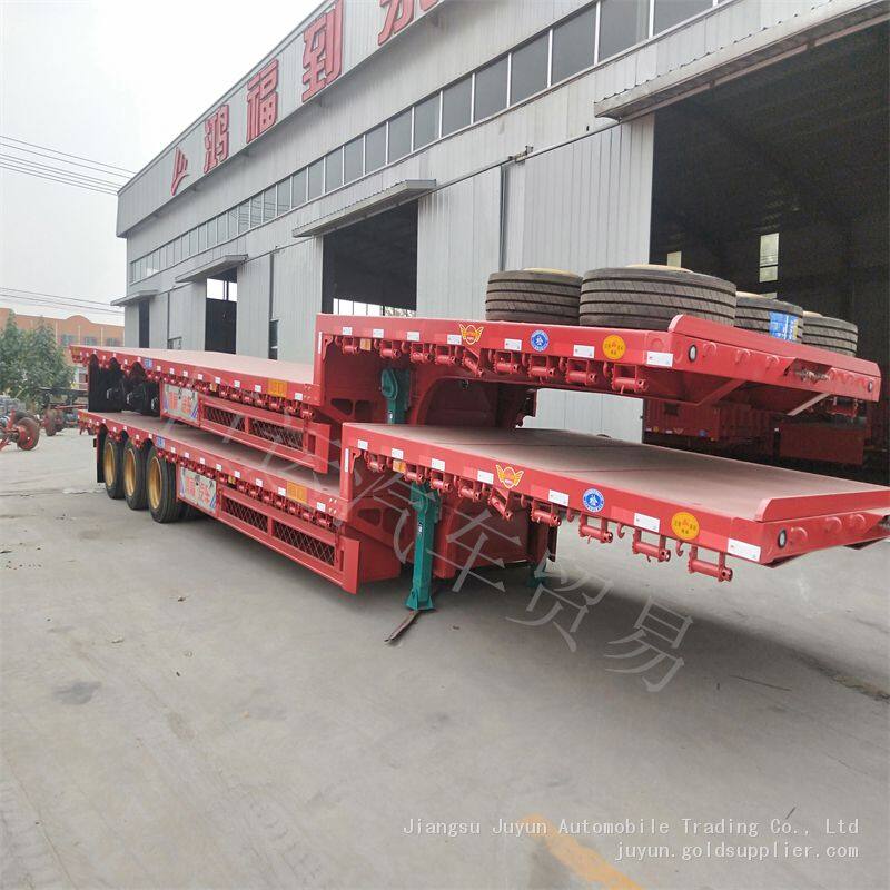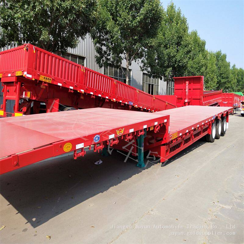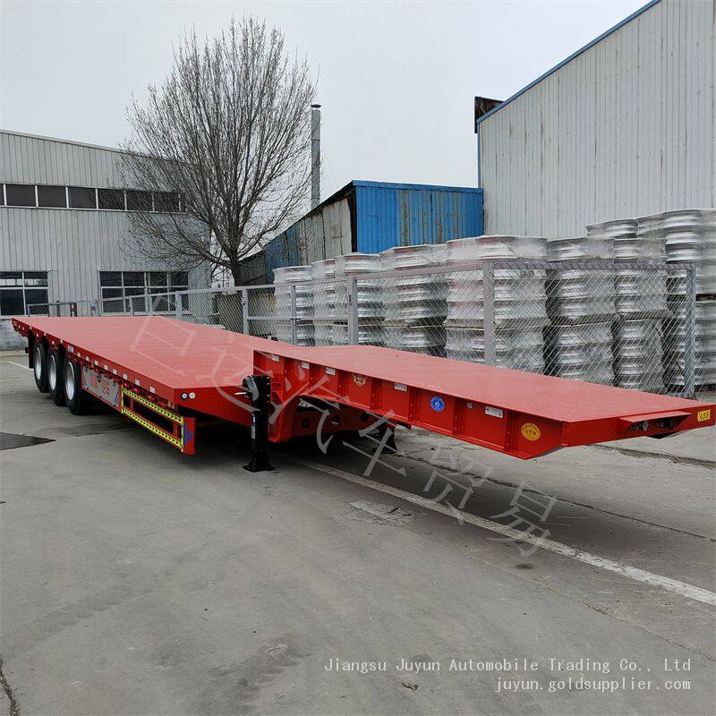 Excavators transport low flatbed semi-trailers, ranging from excavators with a load capacity of 30-300 tons to transport low flatbed semi-trailers. Therefore, excavators transporting low flatbed semi-trailers are professionally designed and manufactured according to customer needs. The low flatbed semi-trailer of construction machinery transportation has no railings in the vehicle body, and is widely used, mainly for medium and long-distance freight transportation.