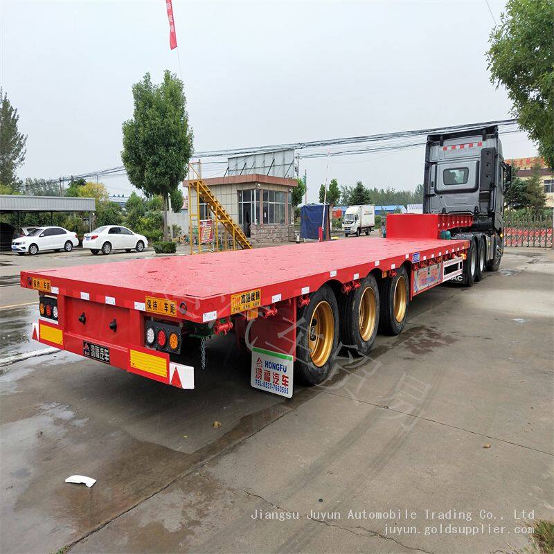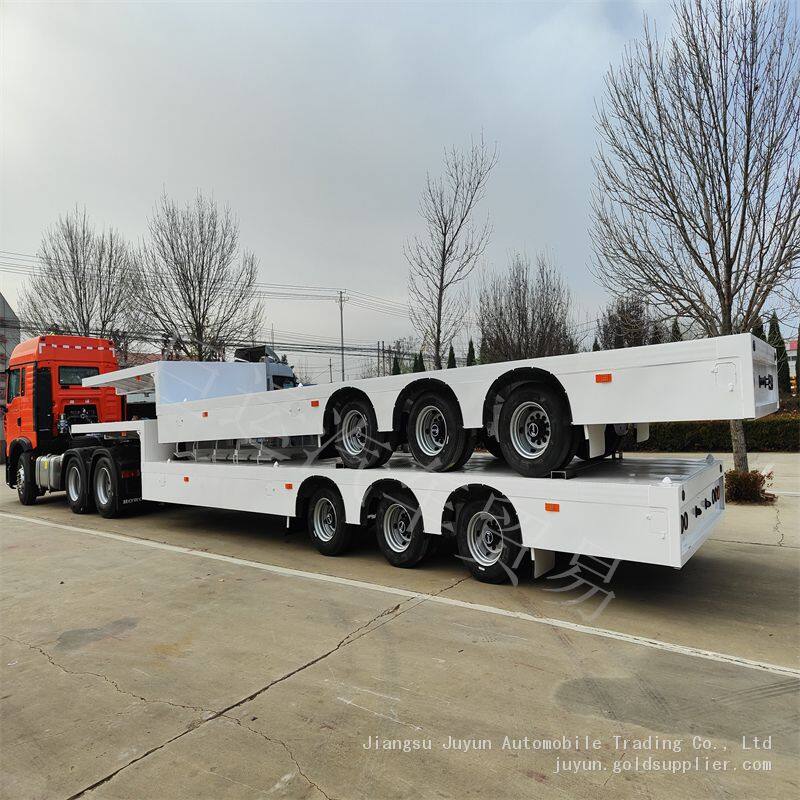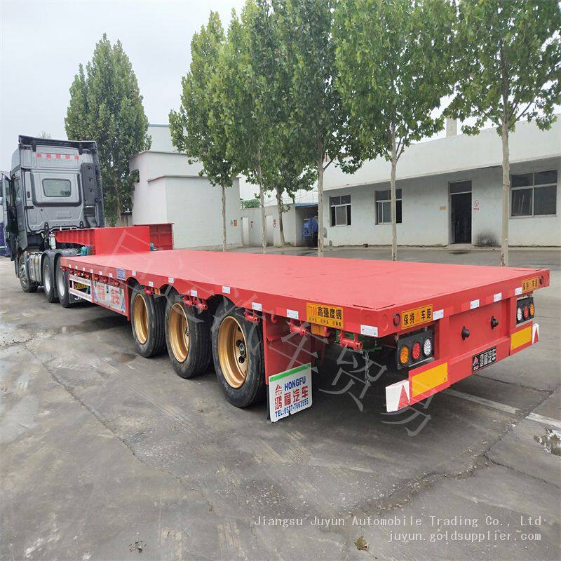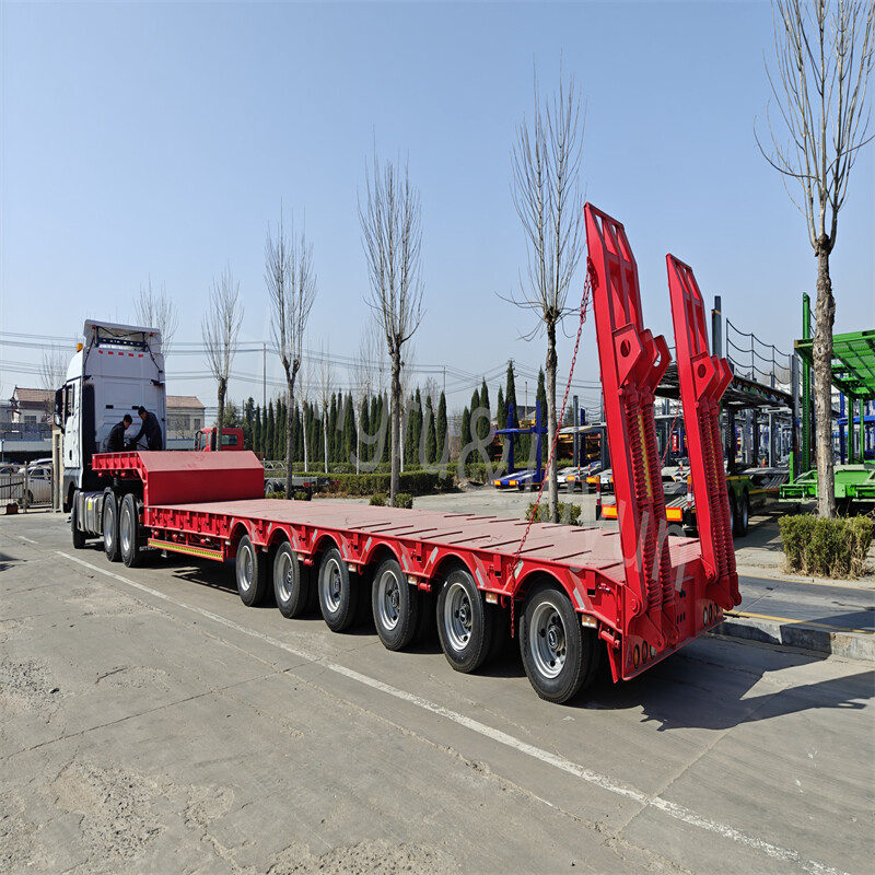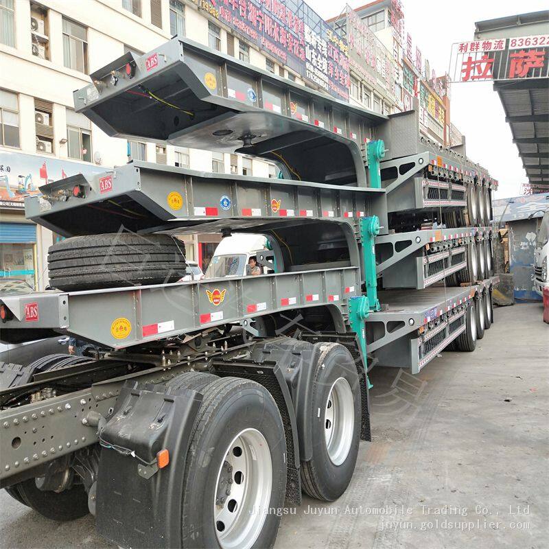Excavators transport low flatbed semi-trailers, ranging from excavators with a load capacity of 30-300 tons to transport low flatbed semi-trailers. Therefore, excavators transporting low flatbed semi-trailers are professionally designed and manufactured according to customer needs. The low flatbed semi-trailer of construction machinery transportation has no railings in the vehicle body, and is widely used, mainly for medium and long-distance freight transportation.