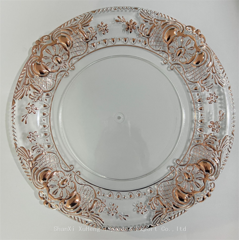 Home > Products > Plastic Charger Plates > Luxury 13 Inch Round Rose Gold Bronzing Flower Plastic Charger Plate For Wedding Party