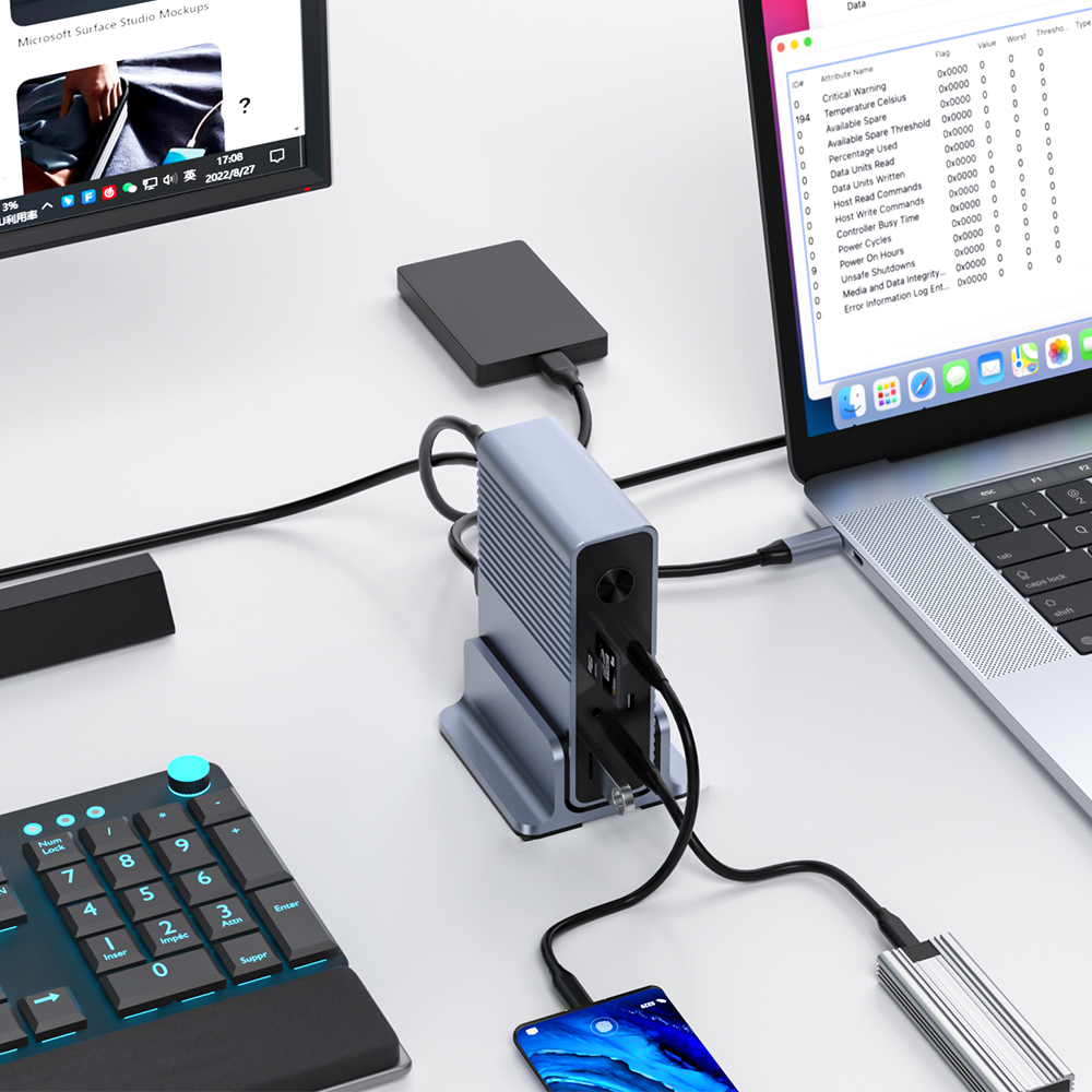 DS015 is a 14-in-1 multi-functional docking station that solves 14 office problems at once, gets rid of the problem of insufficient notebook interfaces, and can expand and connect more devices.