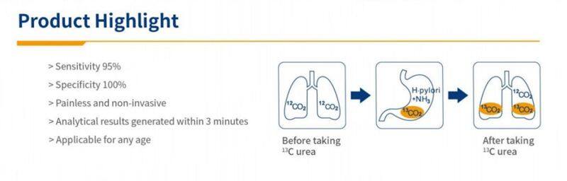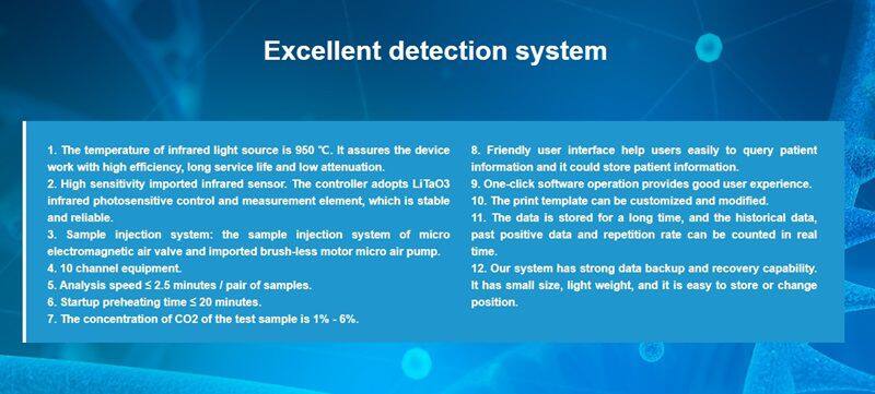 This instrument adopts the principle of non divergent infrared absorption spectroscopy to measure the change in the ratio of 13CO2 and 12CO2 content in the exhaled gas of the subject before and after taking urea [13C] reagent, in order to determine whether the subject is infected with Hp.