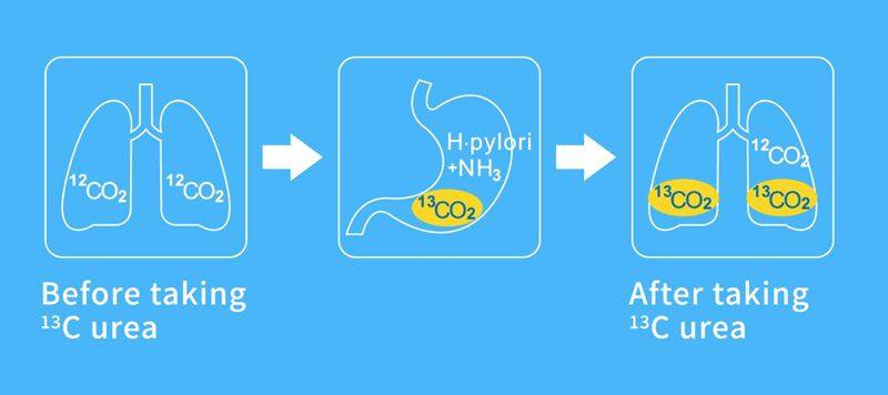 The urease produced by Helicobacter pylori (Hp) in the human stomach can decompose urea [13C] reagent into NH3 and 13C labeled CO2.