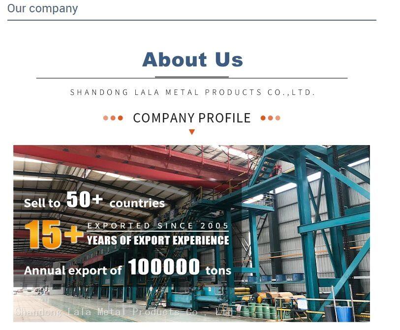 Shandong Lala Metal Products Co , Ltd is one of the leading fasteners and steel products exporter in china , is well-known in the industry with many years of export experience . Our main products:common nails , roofing nails , concrete nails , corrugated roofing sheet ,PPGI coils , GI coils , square hollow tube , round pipe , cold rolled steel sheet, wire , wire mesh and all kinds of agricultural tools . We are located in Linyi city , Shandong Province , with convenient transportation access , Dedicated to strict quality control and thoughtful customer service , we insist quality first and fast delivery , our experienced staff members are always available to discuss your requirements and ensure full customer satisfaction , We also welcome OEM and ODM orders . Whether selecting a current product from our catalog or seeking engineering assistance for your application , you can talk to our customer service center about your sourcing requirements