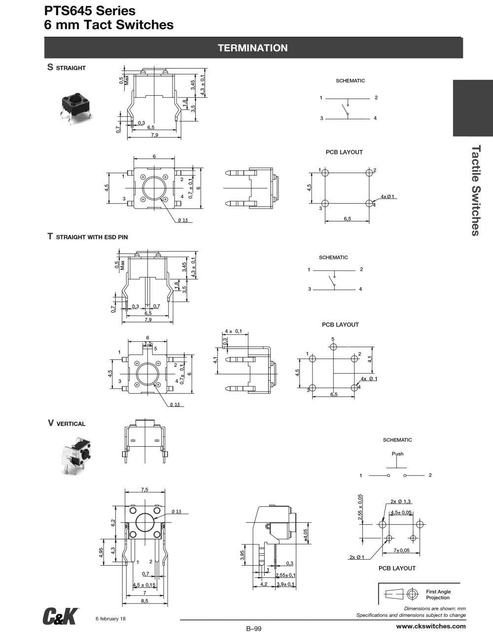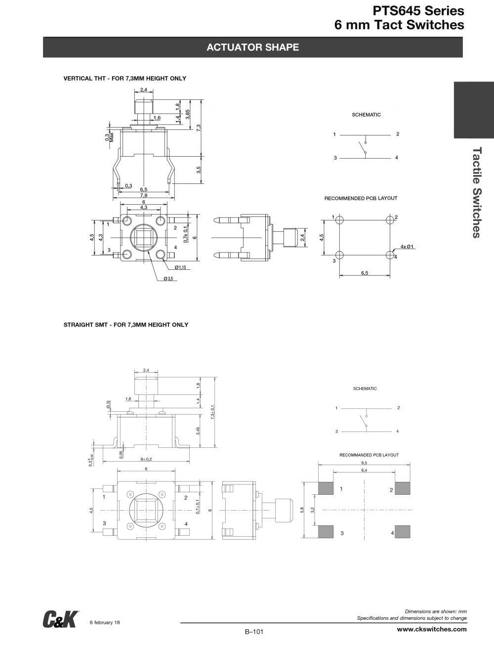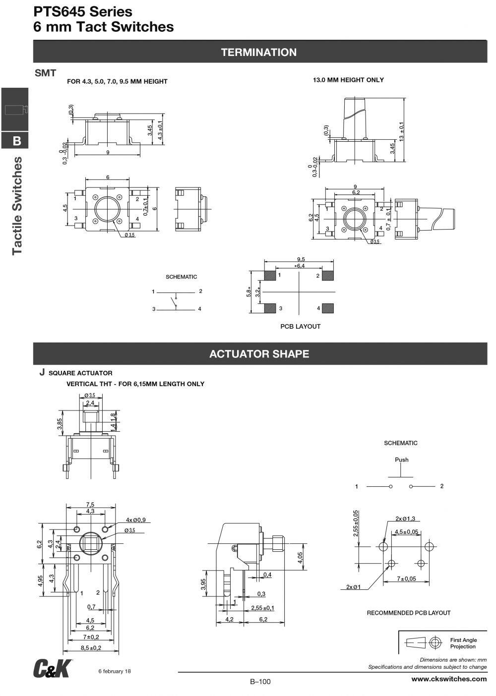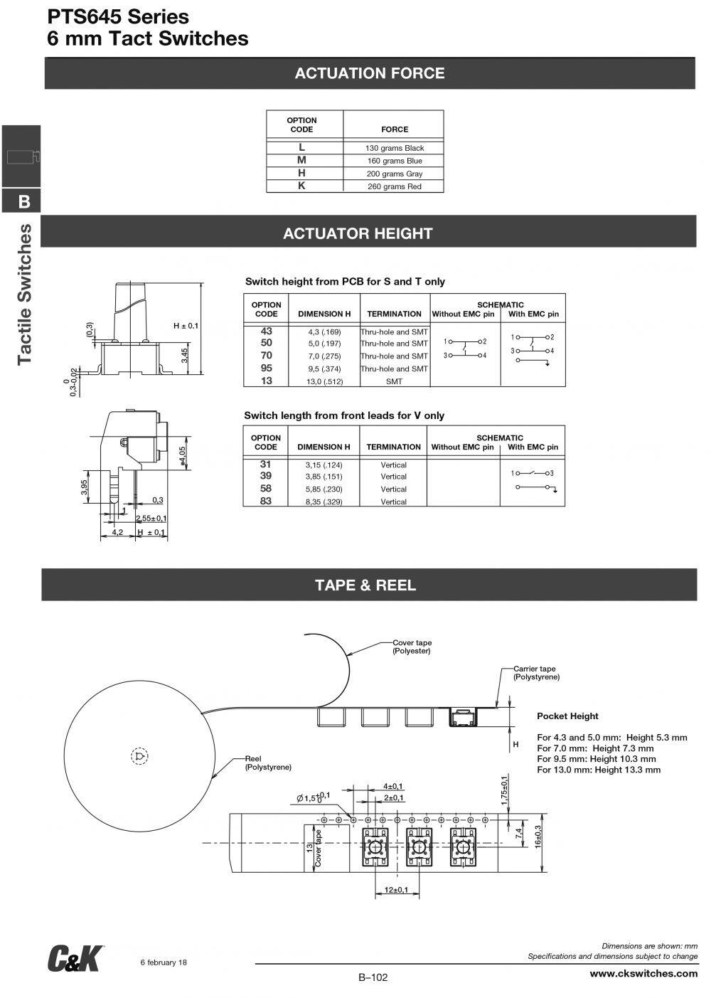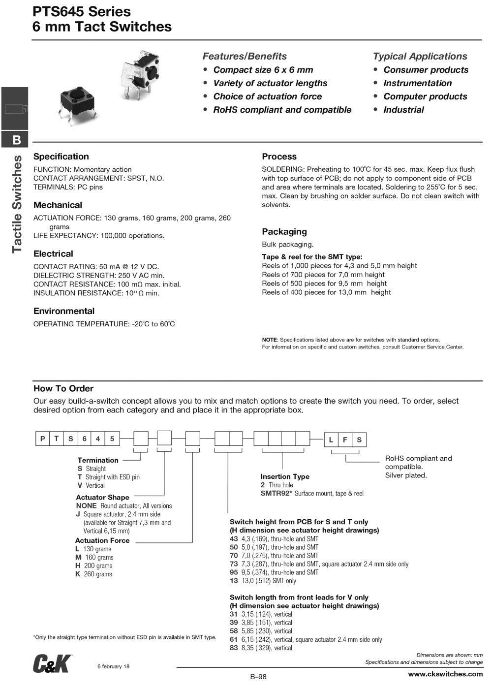 Original C&K Genuine PTS645SK43SMTR92 LFS 6X6X4.3H 260GF SMT Switch