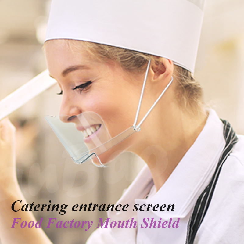 Protective mouth screen, transparent, made of PC material, suitable for the catering and food industry. It has the characteristics of preventing saliva splashing, dust, and oil fume splashing on the face. A box of 1000 pieces, a total of 20 small boxes, each containing 50 pieces, with 10 pieces in a plastic bag.