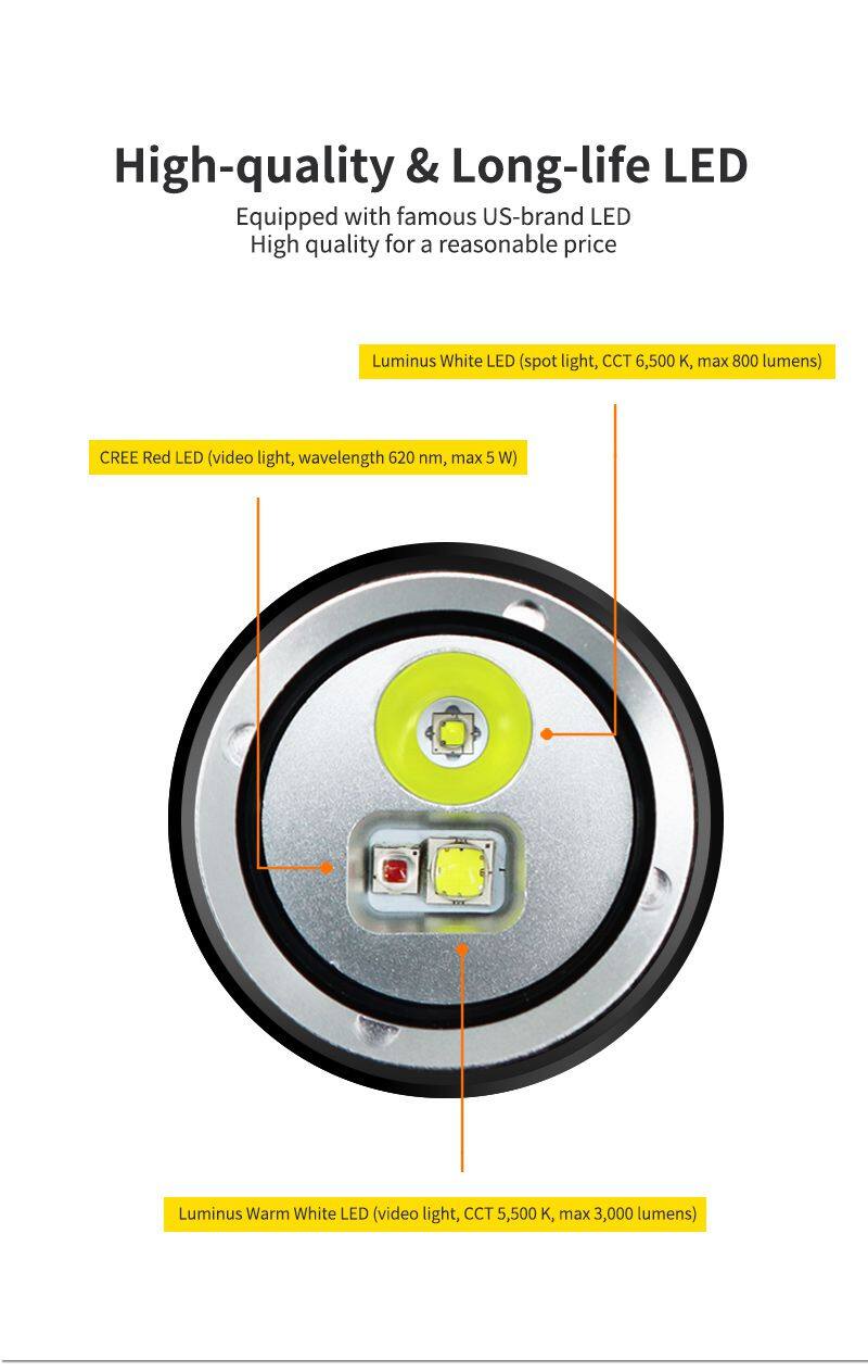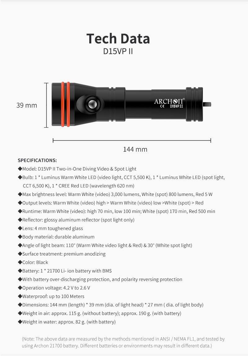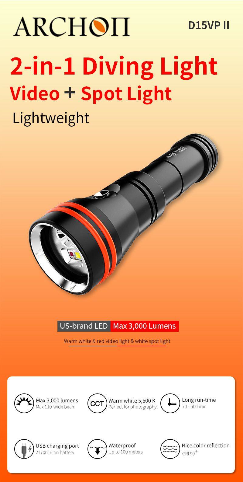 ARCHON D15VPII&W21VPII Diving Video Light & Diving Spot Flashlight & Scuba Dive Torch 3000lumens Red Lamp