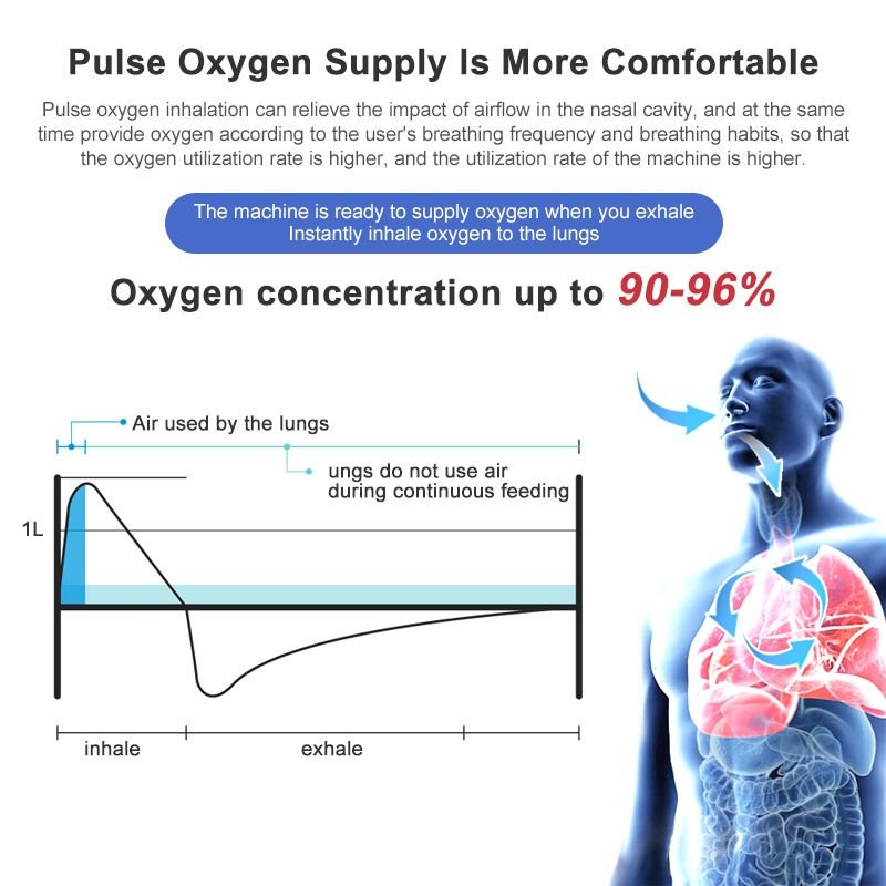 1. Pulse oxygen generation. Ultimate silence, small size, light weight, minimal maintenance, and large screen display.