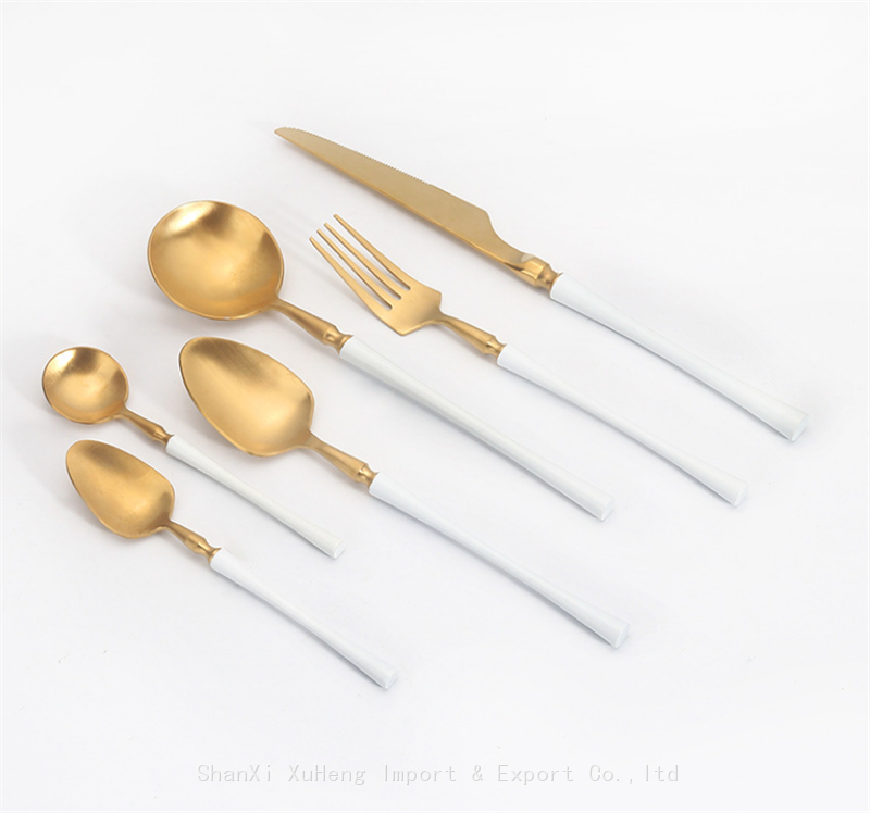 Set of 6 Pieces Matte Gold Knife Fork Spoon Cutlery Set With White Handle For Wedding Tableware