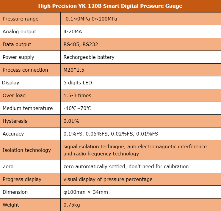 YK-120B digital precision presure gauge is a new product of our company, is mainly designed and produce for measurement work, with characteristic of high acquisition frequency, good stability, small precision loss, is most popular with the measuring workers.