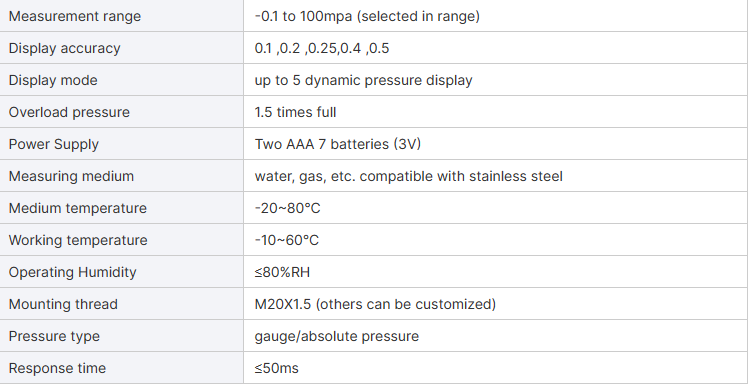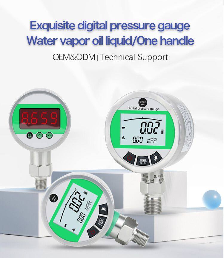 The digital pressure gauge is mainly composed of a housing, a pressure sensor and a signal processing circuit, and has the advantages of high precision, good corrosion resistance, impact resistance, shock resistance, small temperature drift, and good stability; the micro power processor can be used to continuously Use time.