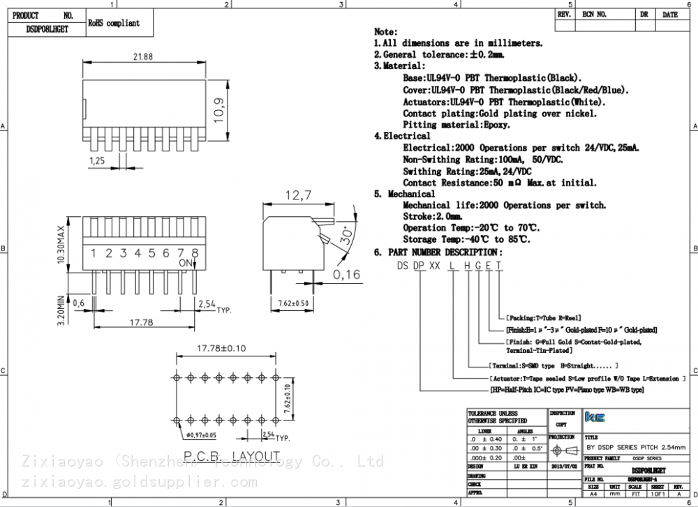 Taiwan Genuine Dial Switch 90 Degree Angle Toggle Switch DSDA08LHGET High-temperature Resistant Piano Key Switch
