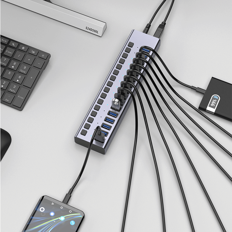 16-port USB3.0HUB, unique LED indicator design, button control switch, control the working status of USB devices; USB3.0 interface supports hot plug, plug and play, easy to use, easy to carry, complies with USB3.0 specifications, supports high speed 5Gbps bandwidth transmission, and backward compatible with USB2.0/USB1.0. The independent voltage design can provide strong and stable power supply for peripheral devices; improve work efficiency and enrich life and entertainment.