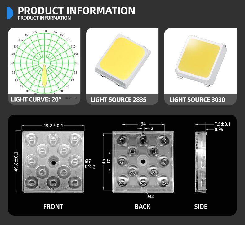 The 5050 12-in-1 lens is mainly used in street lamps and is an important part of street lamps. Because it is a standard size, so customers can assemble according to their own needs, high quality and low price.