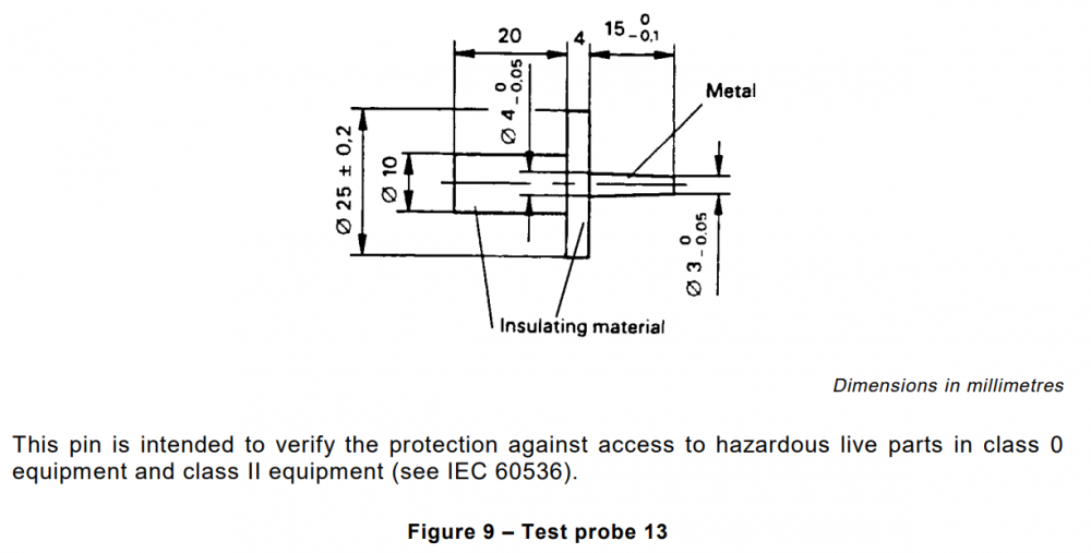 This pin is intended to verify the protection against access to hazardous live parts in class 0 equipment and class II equipment (see IEC 60536).