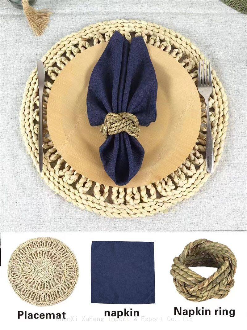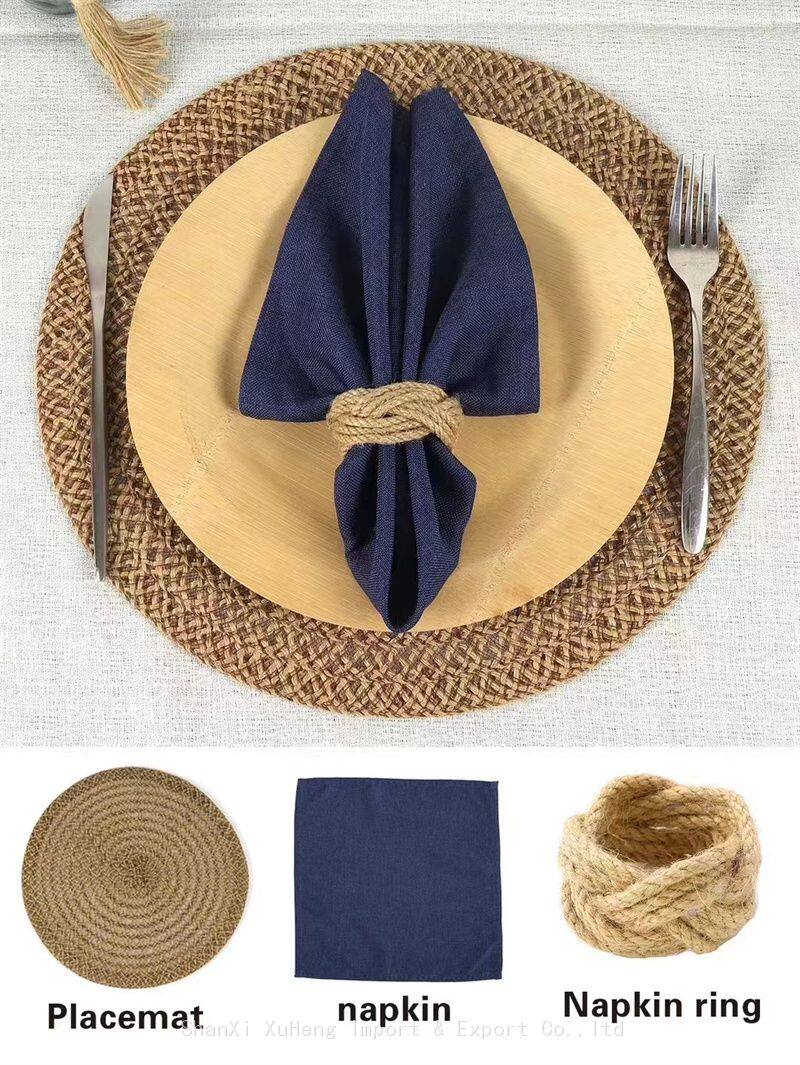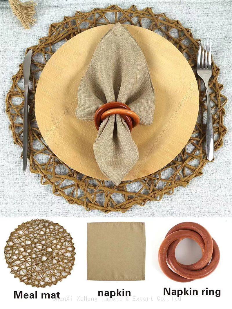 Most Popular Round Shaped Grass Rattan Table Mat Wood Napkin Ring And Gold Colored Table Napkin Cloth Collections For Wedding Table Decoration