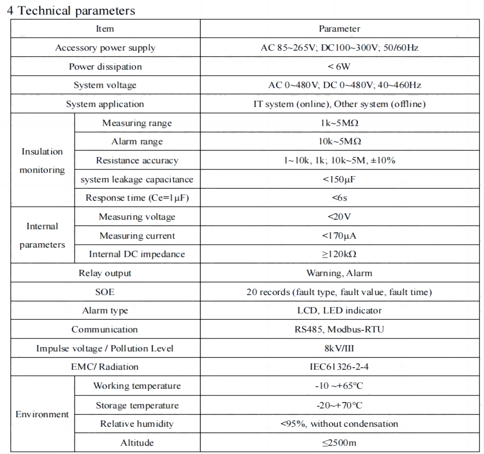 2 Functional characteristics 2.1 Function of monitoring, fault warning and alarm the ground insulation resistance for IT system; 2.2 Multiple fault indication function, such as relay alarm output, LED alarm indication and so on. 2.3 Advanced field bus communication technology, communicate with the external alarm and display device or the upper computer management terminal and monitor the operation status of the IT system in real time. 2.4 Fault event recording function. It can record the time and type of failure to provide convenience for operators to query and analyze the operation status of the system and eliminate faults in time. 2.5 Applicable for insulation monitoring of AC, DC and AC / DC hybrid IT systems. 2.6 Self checking function. realize the fault self-inspection of instrument hardware circuit. 2.7 Broken line monitoring function. Monitor the connection condition between the L1/L2 and the IT system and the connection condition of the PE/KE function grounding wire.