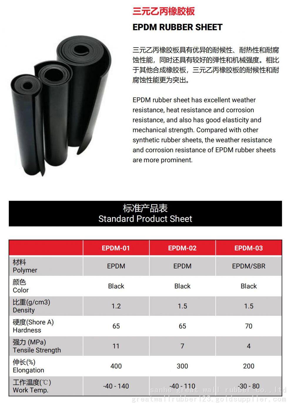 EPDM rubber sheet has excellent weather resistance, heat resistance and corrosion resistance, and also has good elasticity and mechanical strength. Compared with other synthetic rubber sheets, the weather resistance and corrosion resistance of EPDM rubber sheets are more prominent.