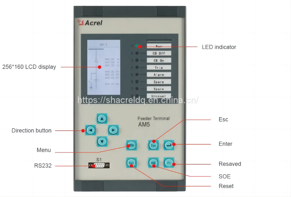 AM5SE-F | Directional overcurrent, overcurrent IDMT, earth fault, earth fault IDMT, overload, trip and close circuit supervision, loss of voltage, PT supervision, three phase auto-reclose, under frequency, over frequency, Post-Accelerated overcurrent, overvoltage, residual overvoltage, directional power, FC block, RS485 (2 ports), modbus serial, IEC 60870-5-103,IEC 60870-5-101, 4-20mA analog output SOE, electric parameter (U,I, P, Q,PF, F, Ep, Eq, Es), remote control, GPS.fault recoeder numbers of circuit breaker trip and close trip and close circuit supervision | Line/Feeder |