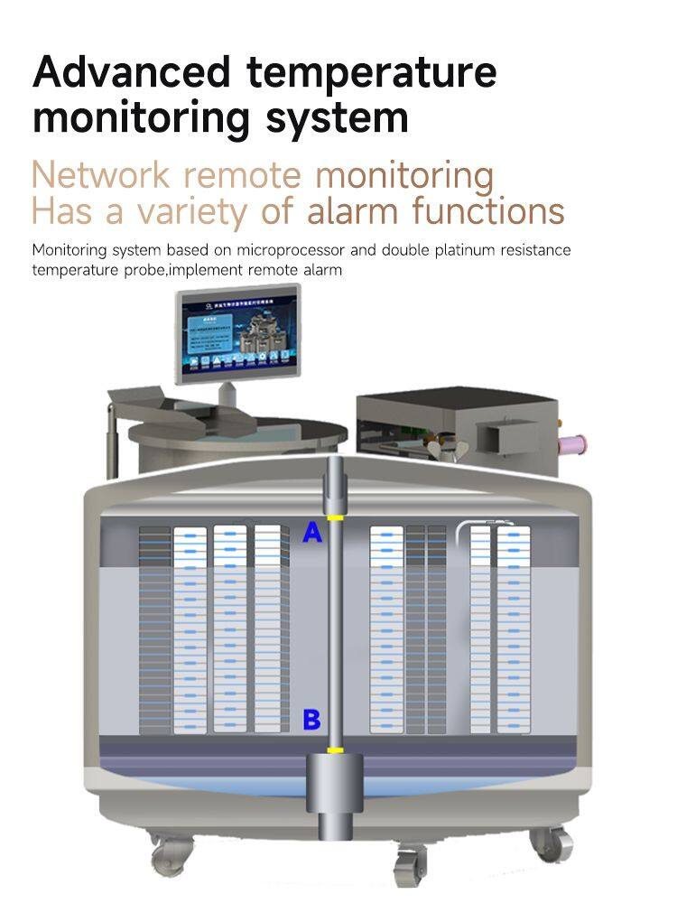 In addition, the gas-phase liquid nitrogen tank also has high dual-gallery vacuum + high thermal insulation performance, which reduces heat conduction, reduces the evaporation rate of liquid nitrogen, and maintains stable pressure inside the tank. The built-in intelligent control management system is used for real-time detection and abnormal warning of temperature, pressure and liquid level to ensure the stability of the tank and the safety of stem cells.