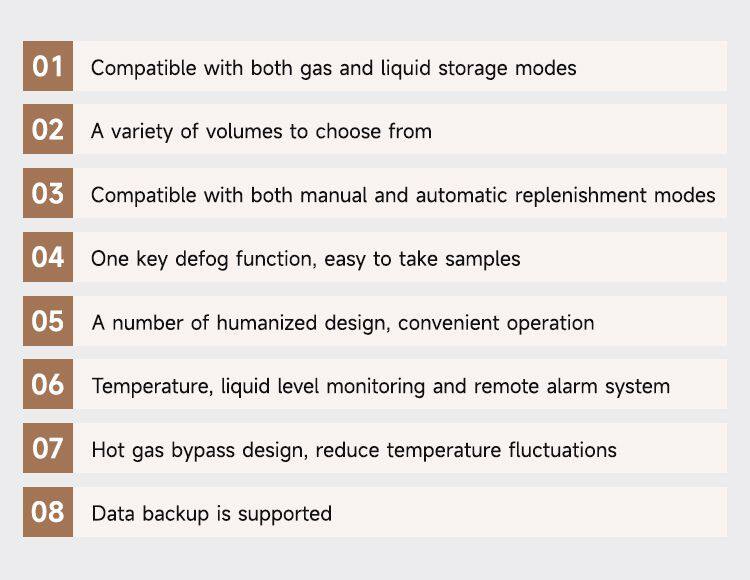 When the nitrogen in the sample storage area is insufficient to support the sample demand, the bottom evaporator starts working to supply liquid nitrogen to the upper part. This has the advantage of avoiding sample cross-contamination.