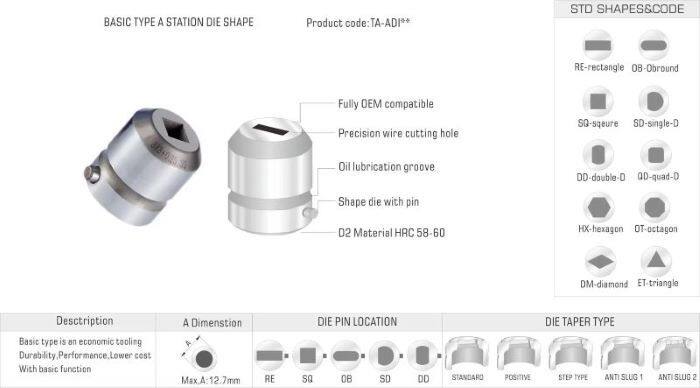 Below show location,die clearance,punch tip,Standard shape:Rectangle,Square,Oblong,QR,QD,Single D,Double D,Hexagon,Octagon