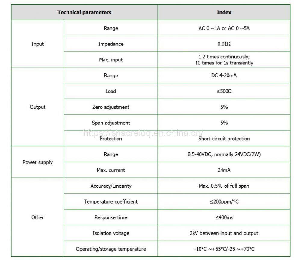 The module can modulate maximum 5A AC or CT current directly and output the isolated 4-20mA signal. The working status and output level of circuit are indicated with LED. The module is equipped with surge protection circuit so that it is suitable under severe conditions.● Input: AC 0-1/5A