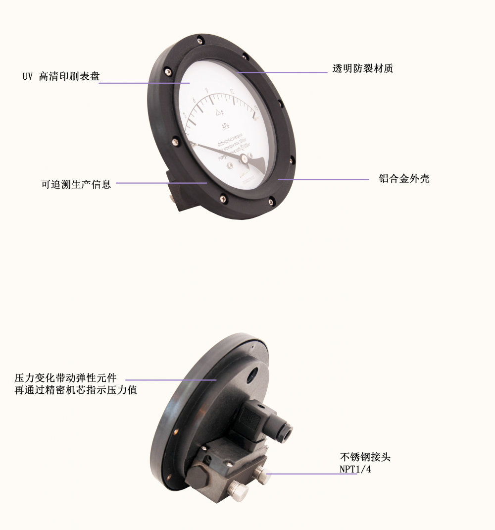 The pressure change drives the elastic element and then indicates the pressure value through the precision movement