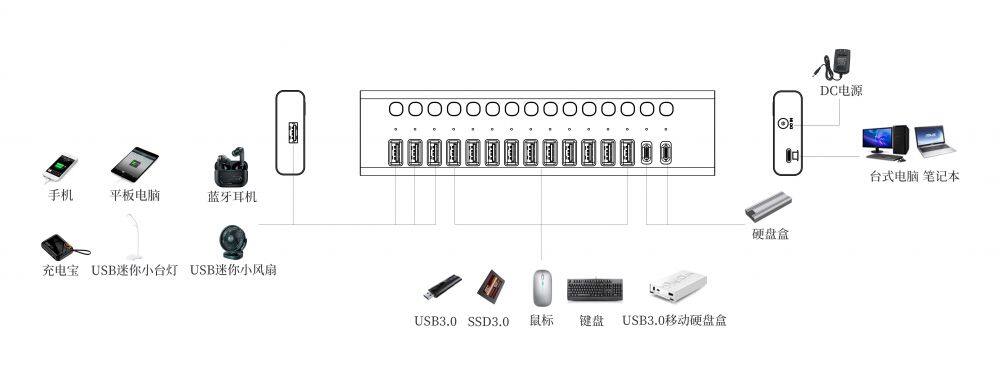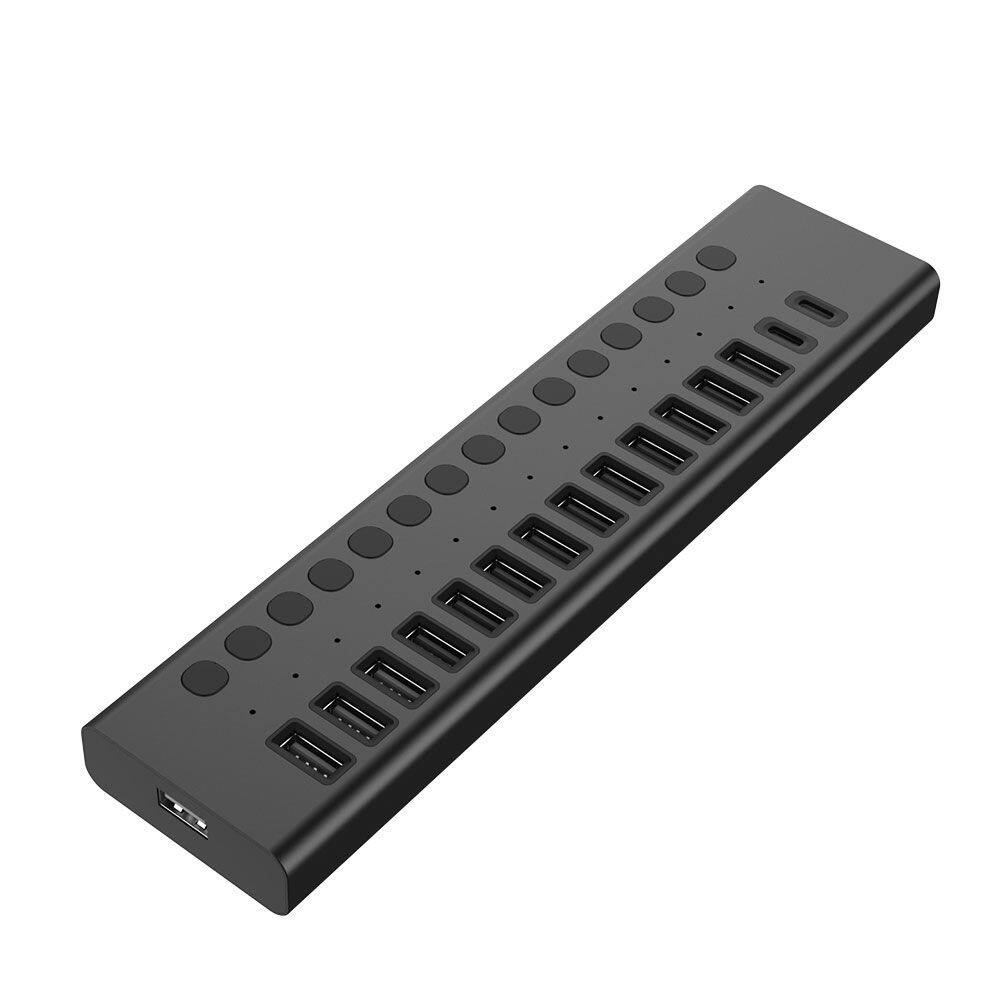 The multi-function 16-port USB3.1 hub is a powerful and flexible multi-function hub that expands worry-free, one is enough,The aluminum alloy shell can quickly export heat, so that the device can operate stably, quickly dissipate heat, refuse to be hot, good compatibility, no need to drive, suitable for most laptops/desktops and other devices。Independent switch design, for you to reduce the number of cumbersome plugging and unplugging, effectively protect the service life of your device USB interface, equipped with LED blue indicator, LED blue prompt light after power-on, working status at a glance. 2 ports support QC3.0 fast charging protocol, 2 ports support APPLE 5V-2.4A/2.1A fast charging protocol, connect mobile phones, tablets can quickly charge to solve charging troubles. 2 TYPE-C ports support USB3.1, 10 ports support USB3.1, and 12 USB ports use U disks, mobile hard disks, mobile phones, mice and other related USB storage devices to transmit data with computers, mobile phones and other devices。