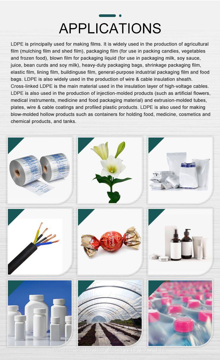 Low-density polyethylene (LDPE) is a synthetic resin using a high pressure process via free radical polymerization of ethylene and is therefore also called "high-pressure polyethylene". Since its molecular chain has many long and short branches, LDPE is less crystalline than high-density polyethylene (HDPE) and its density is lower. It features light, flexible, good freezing resistance and impact resistance. LDPE is chemically stable. It has good resistance to acids (except strongly oxidizing acids), alkali, salt, excellent electrical insulation properties. Its vapor penetration rate is low. LDPE has high fluidity and good processability. It is suitable for being used in all types of thermoplastic processing processes, such as injection molding, extrusion molding, blow molding, rotomolding, coating, foaming, thermoforming, hot-jet welding and thermal welding.