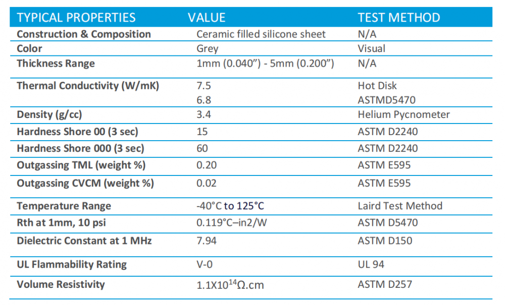 LAIRD Tflex HD7.5 gap filler is available in thickness from 1mm (0.040”) to 5mm (0.200”).