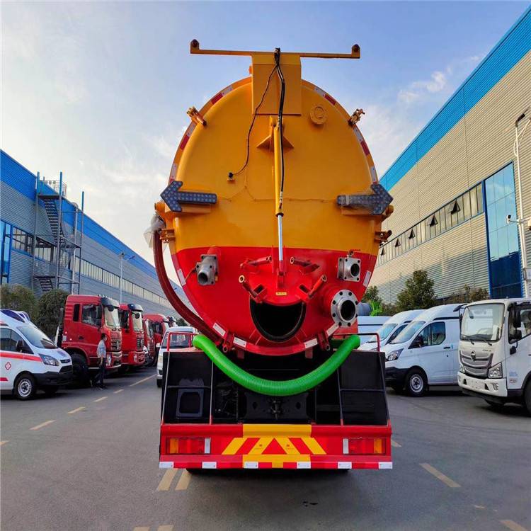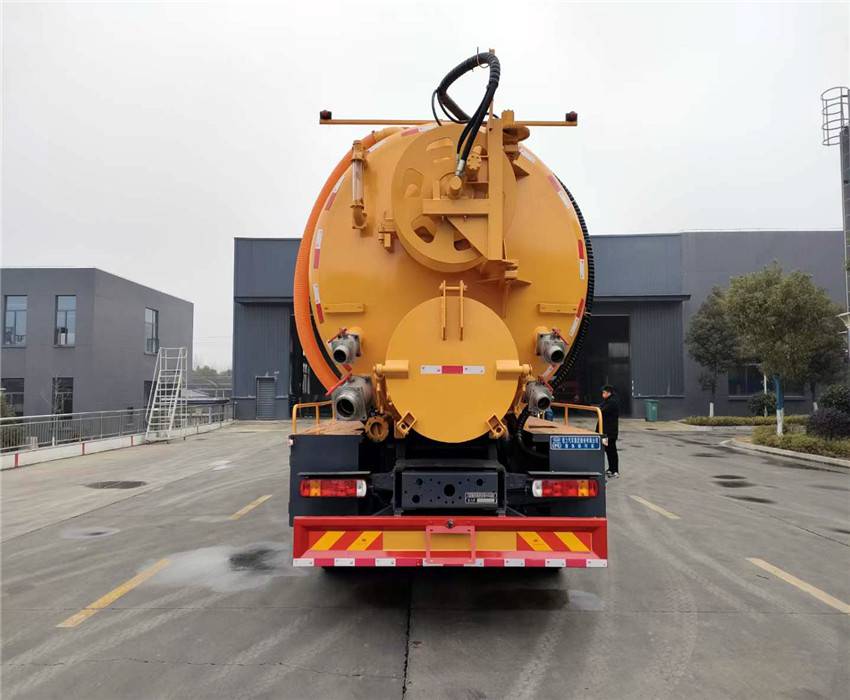 Rear protective ground clearance (mm): 480; Effective volume of tank (cubic meters), external dimensions of tank (mm): Tank size (straight section length x diameter) (mm): 7100 x 2350. The front half of the tank is a clean water tank, and the back half is a sewage tank. The suction tank and water tank are two independent containers that cannot be fully loaded at the same time. The tank can be lifted*** Function and device description: The vehicle is equipped with a power take-off and vacuum pump for suction of dirt; Equipped with high-pressure water pump and high-pressure water pipe for cleaning; Optional top cover structure, optional rolling shutter door, and optional vehicle appearance style